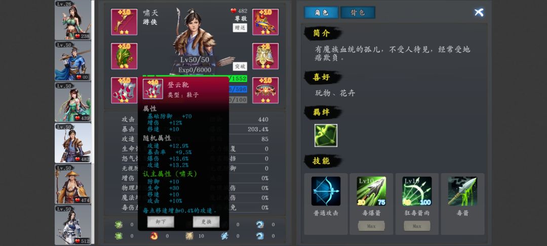 现在版本可以无视体力无限刷副本。坦克根本不用养,毫无用处。上场吃经验就行。除了主线及招募对象,不必去刷其他角色好感。绣花鞋由于唯一性,看各人喜好刷不刷吧。 前期推荐首养戒空顾梦瑶。凑齐法师四件套加佛骨戒,词条稍微洗一下基本横推了。 然后可以养啸天,主角和洛羽二选一。 原因:啸天毒伤无视防御,技能不吃物理套,可以全红装堆伤害,后期可以达到满爆击和200%攻速。 主角三技能自带60%多攻速,红剑也有2