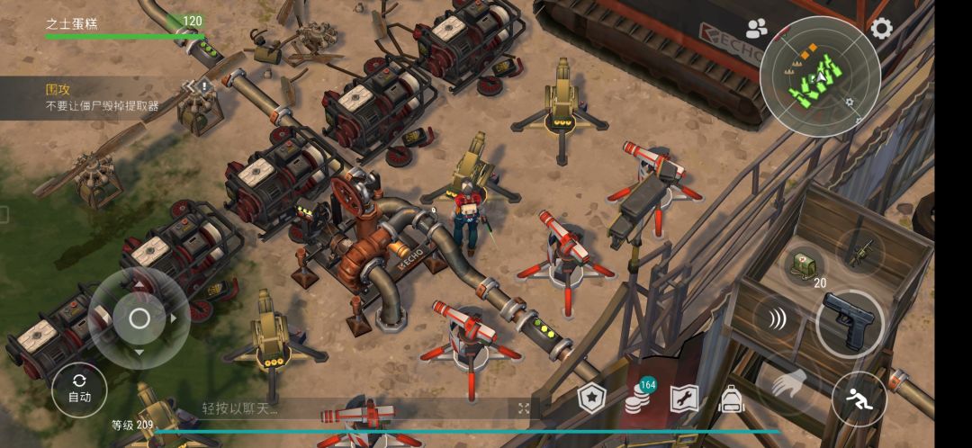 因为回声任务难度较高,大佬发明了卡发动机的打法。但是仍然需要等“僵尸优先攻击人物”buff。 我发现不等buff也能无伤刷回声。 布局和大佬们的一样,部分僵尸会直奔你而来,这可以按照老办法刷他们 还有一些僵尸会直接拆机器,在僵尸拆完前面的三个提取器之后,就会在第二个机器那里挂机。就算你拿拳头轮他也不会还手。 在打死其中一部分僵尸之后,可能会刷出新一波僵尸,只需要跑回去接着刷就行了。 最后当僵尸不出