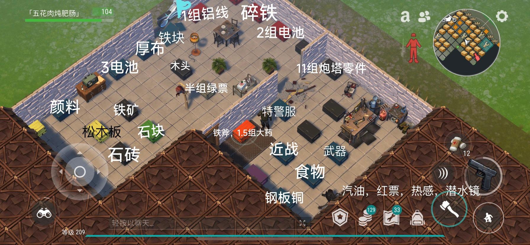 准备3c4、1引擎、若干石斧 吃鱼,由于更新为了无限搬运只能进一次铁皮了,而且这个家的墙为了卡进铁皮就没办法再摸车出来所以就把外面有价值的东西拿完 从这里炸两个c4然后把图中所示箱子都开了 再去左下角把鸡肉箱那边的墙炸了,箱子开了 (不需要鸡肉的可以把加特林箱子面墙炸开,去搬另一个黄票箱子,具体位置借鉴论坛其他抄家贴,这种炸开以后更好进铁皮,转角卡比平面卡好进的多) 这时噪音刚好,留一个胖子,然后