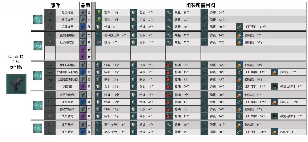 B站链接: 群内提供整个文件,pdf和jpg文件 ———————————————————— 蓝图配方表: ———————————————————— 武器部件改良属性表: