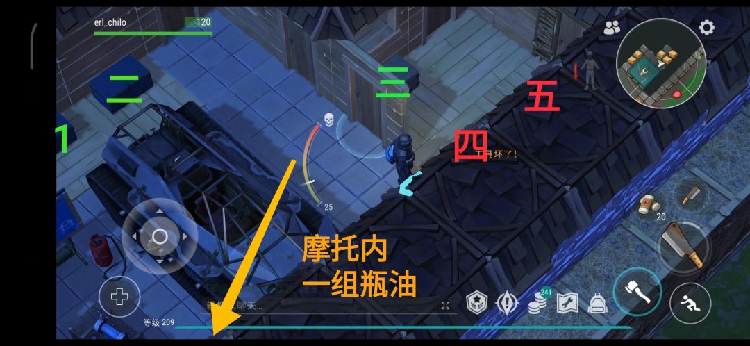 准备1c4、1铁斧、若干石斧、20空瓶子,不用穿衣服带武器,就靠狗咬就行,皮卡右上角有刺可以自杀 进图先摸摩托车把油装了,他家车满油,要装40空瓶 进图第一炸这里 然后去右边把炮塔锤了,把发电机放车屁股,然后把车停好 比较有价值的箱子先开,内容如下 其他箱子没什么价值 剩下有价值的武器和药在皮卡右上角了 由于是正抄,其他地方就不探索了,有抄到的可以补充一下