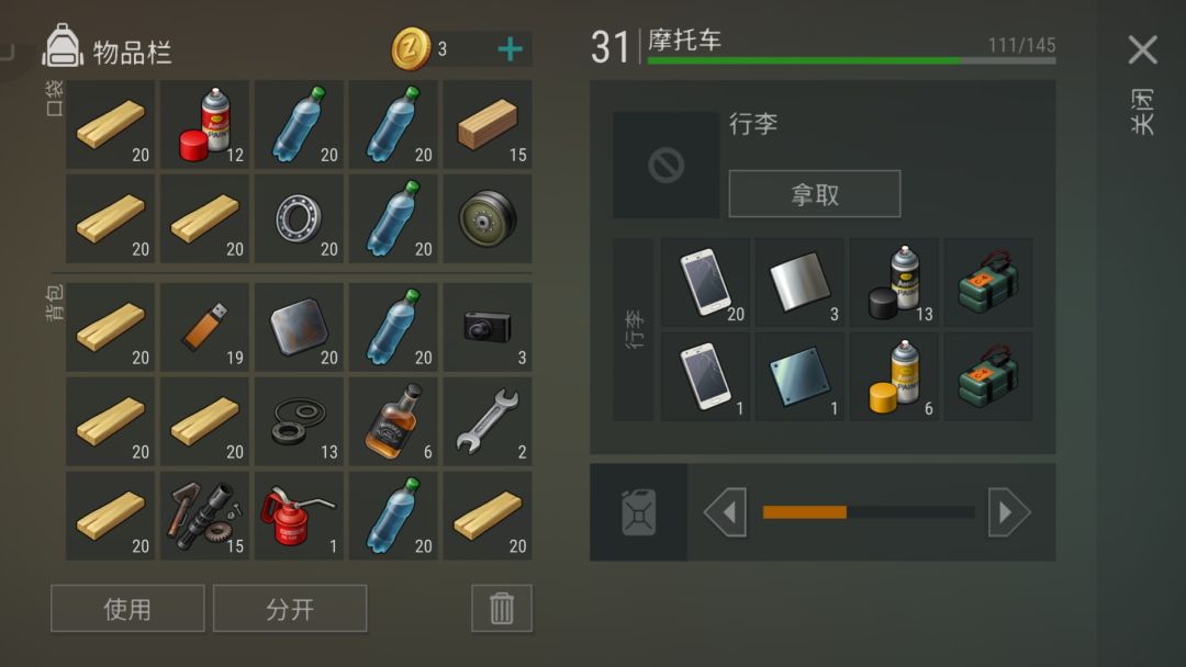 需要带1把铁斧,1个C4,9把斧头。 右边这边用铁斧打开,可以卡摩托,靠石头墙的一个木材加工有20木板,其他没啥,家里还有1个发电机别忘记带走,收获如下: