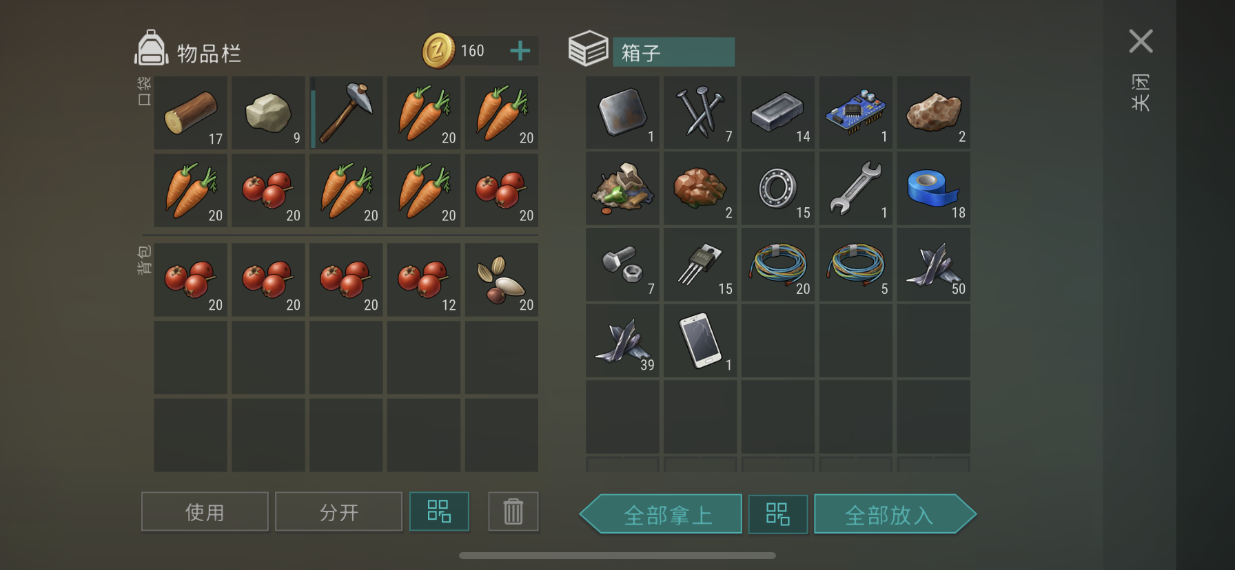 1有几把锯子和锤子,2有几把枪,3有一些药,除此之外木头石头有好些组,正搬拿不完,反抄噪音够拆完箱子