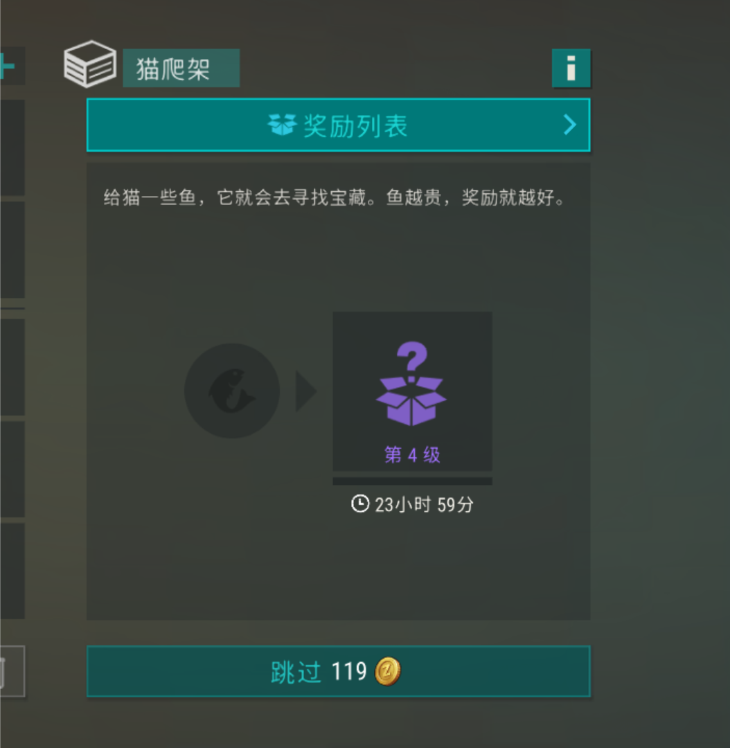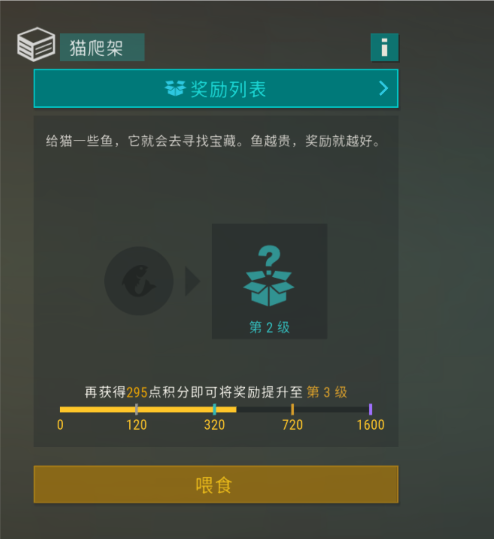 首先喂鱼,一条铜鲈鱼加10分、一条银鲈鱼加20分、一条金鲈鱼加30分,一条铜鲤鱼加15分、一条金鲤鱼35分、一条铜鳟鱼加20分、一条铜鲑鱼加20分、一条铜梭鱼加30分、一条金梭鱼220分、一条铜鲶鱼加30分、一条铜鲟鱼加50分、一条金鲟鱼加335分...其次是奖励档,120分开启第一档、320分开启第二档、720分开启第三档、1600分开启第四档。每档的奖励如图所示。最后是所需的时间,放完鱼后