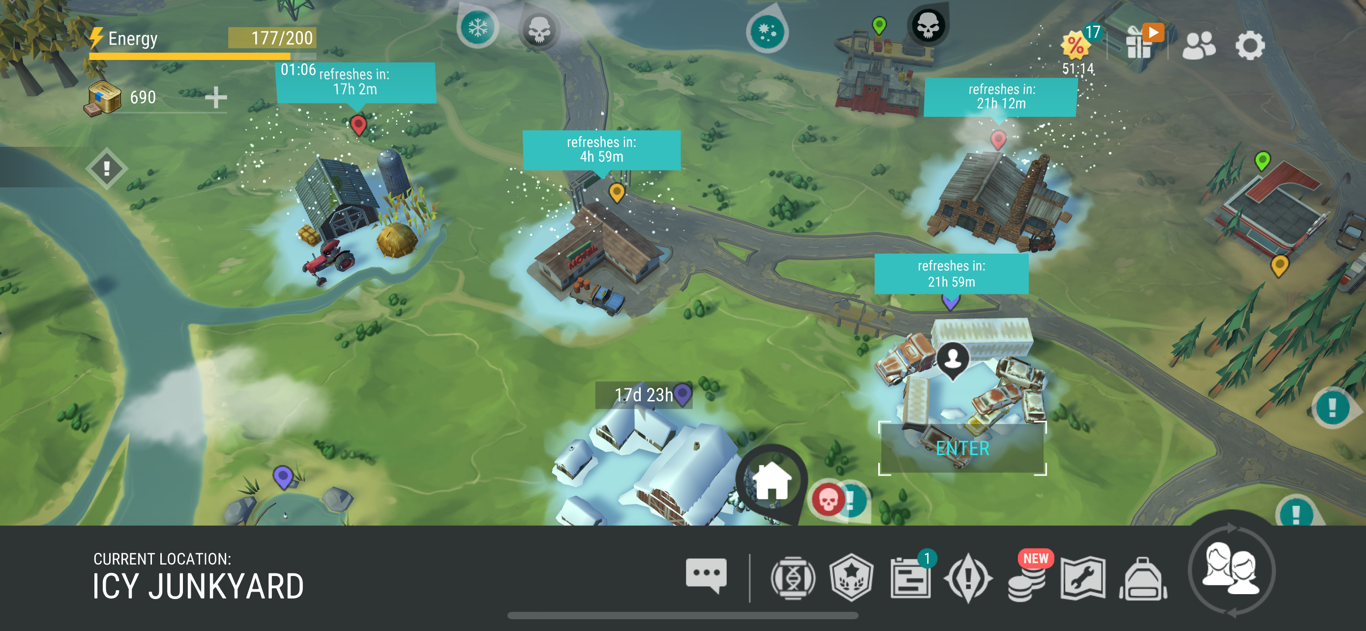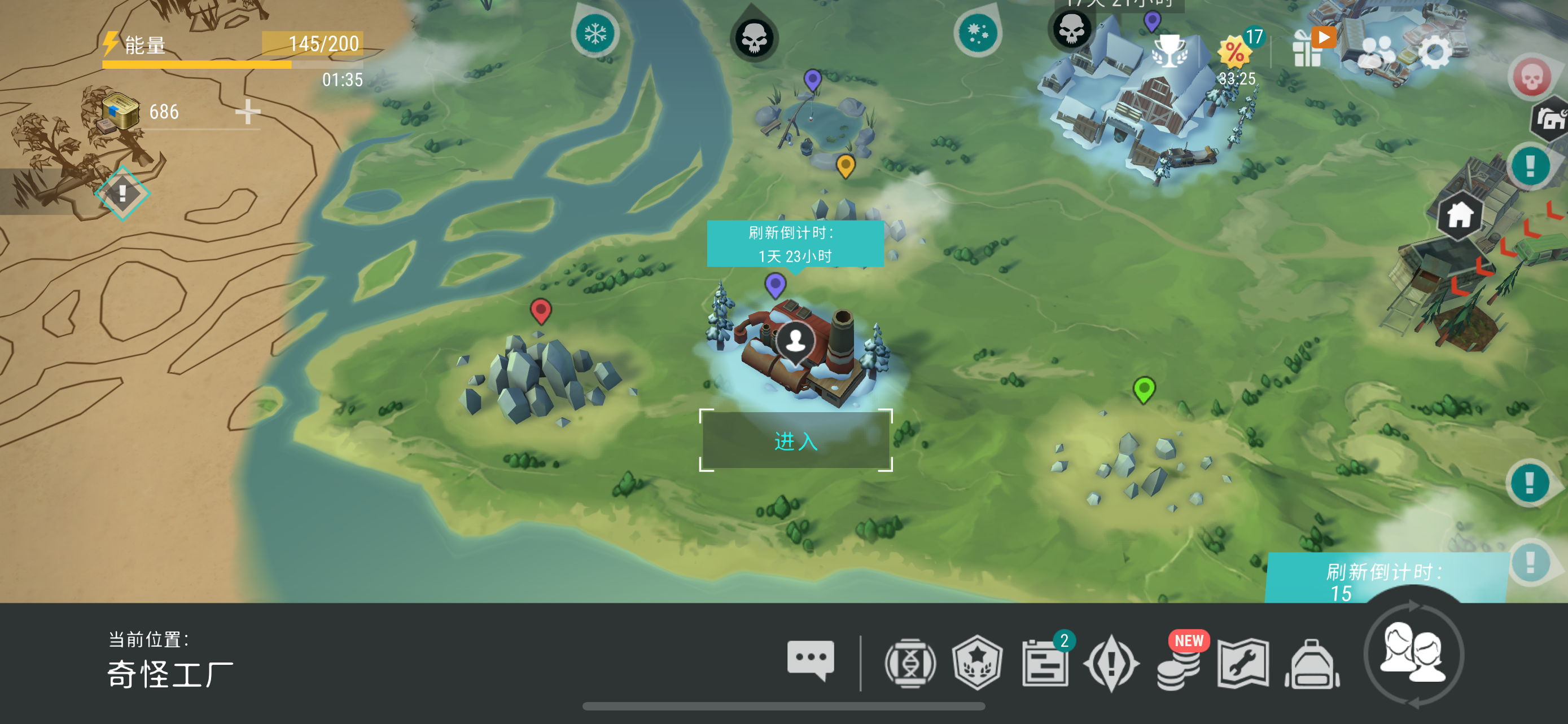 在开始之前我要说一下我的悲惨经历我提前一天卡的地点CD 结果活动开始这天地图并没有刷新所以能获取电池的尸体和活动道具箱子都没刷出来从而我花了80口粮左右把警局A堡工厂旅馆农场刷新了但是由于刷新枢纽太贵且有地点物品内置cd(2天)太过不值所以等我后面补上吧没做废品站的先做废品站再清本这次绝望寒冬和以往一样 没什么变化老三样 通暖气 清废品站 打奇怪工厂除去奇怪工厂和废品站的声望物