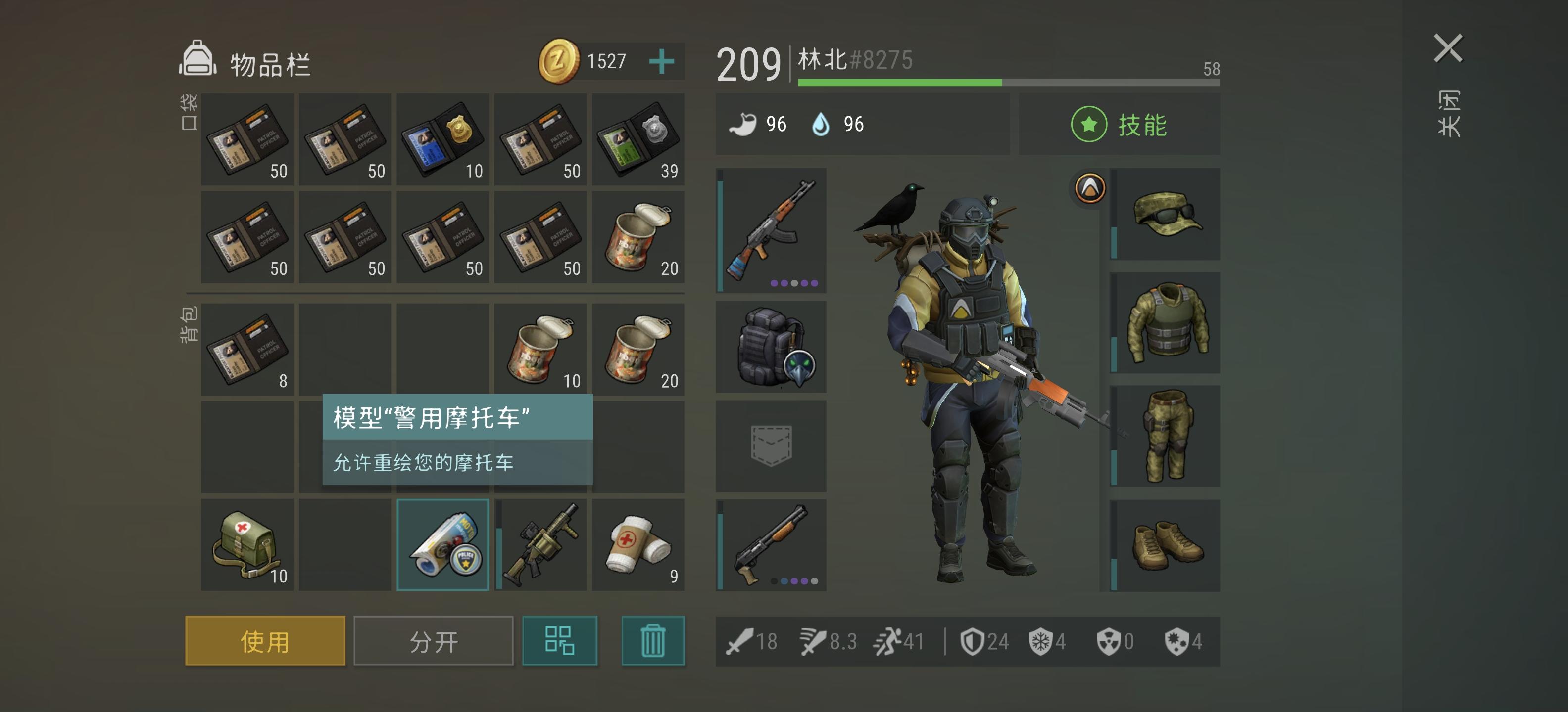 今天一级图打资源第一局松树丛跑出来几个喷毒僵尸,还遇到科瓦斯基中士,怕是警局回血怪就没打,底下肃清的车有厚血僵尸守着,摸尸给7个起源纹章。于是跑到石灰石挖铁矿。第一局石灰石遇到军事营地,有受伤的要我拿绷带救他,没救,营地里1砍刀2个半耐久的绿裤子,一点耐久的机枪和断指。第二次石灰石刷新出个病态大嚼者守尸,木矛背刺出图反复打的,人类尸体给了房子钥匙,旁边箱子有1锤子,房子里是普通帽子裤子。就
