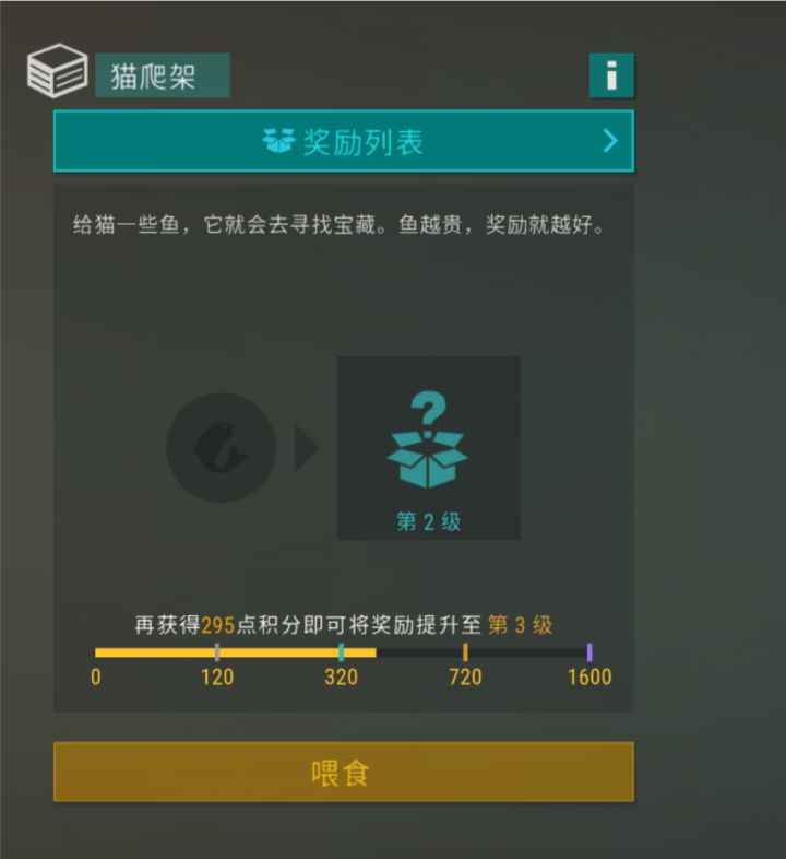 首先喂鱼,一条铜鲈鱼加10分、一条银鲈鱼加20分、一条金鲈鱼加30分,一条铜鲤鱼加15分、一条金鲤鱼35分、一条铜鳟鱼加20分、一条铜鲑鱼加20分、一条铜梭鱼加30分、一条金梭鱼220分、一条铜鲶鱼加30分、一条铜鲟鱼加50分、一条金鲟鱼加335分...其次是奖励档,120分开启第一档、320分开启第二档、720分开启第三档、1600分开启第四档。每档的奖励如图所示。最后是所需的时间,放完鱼后