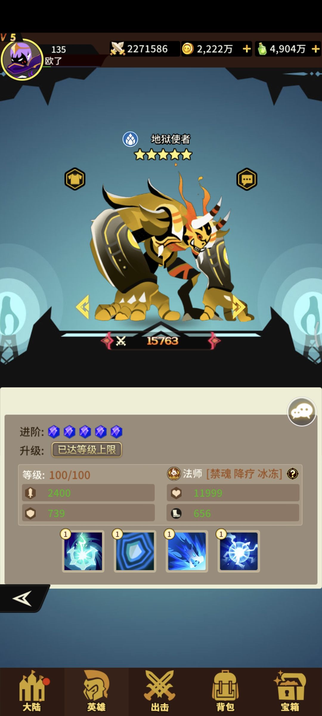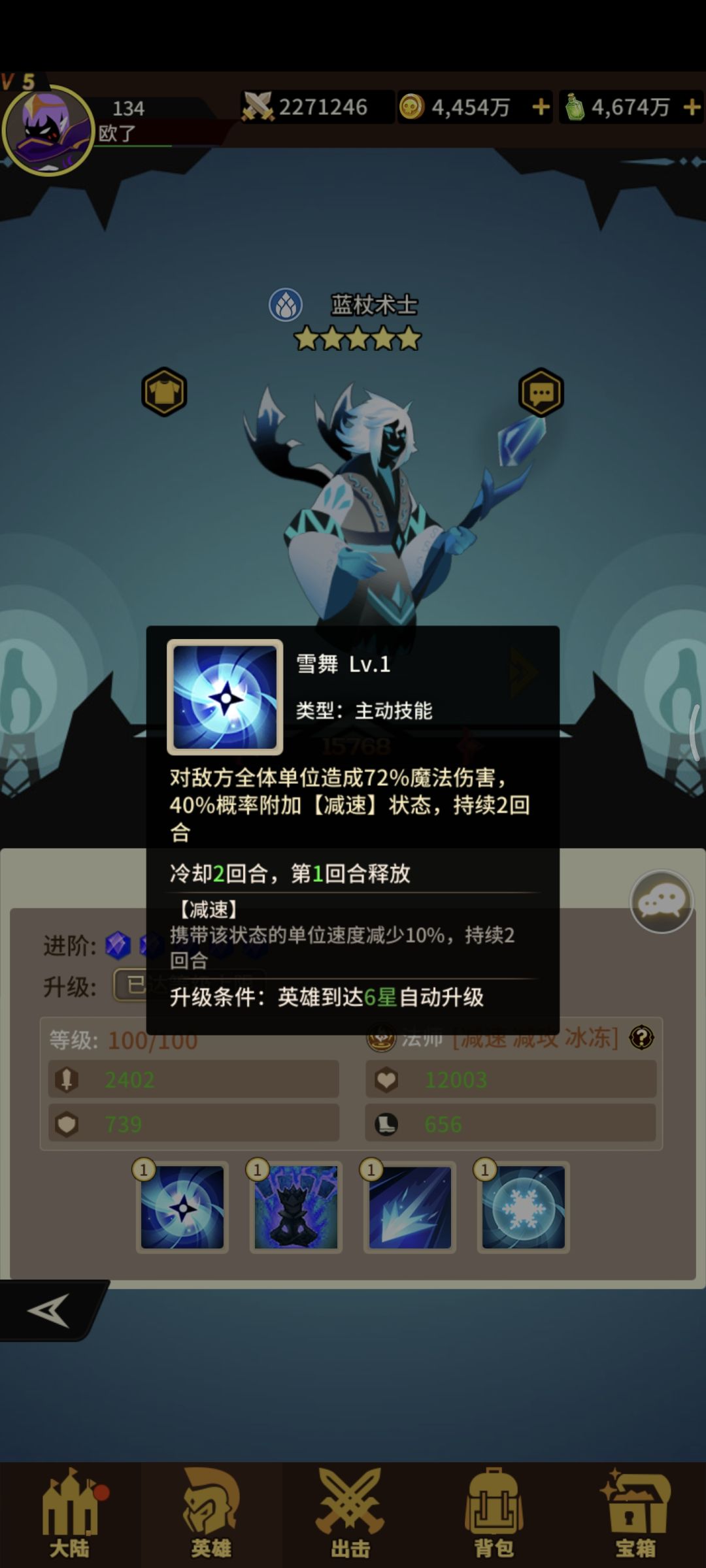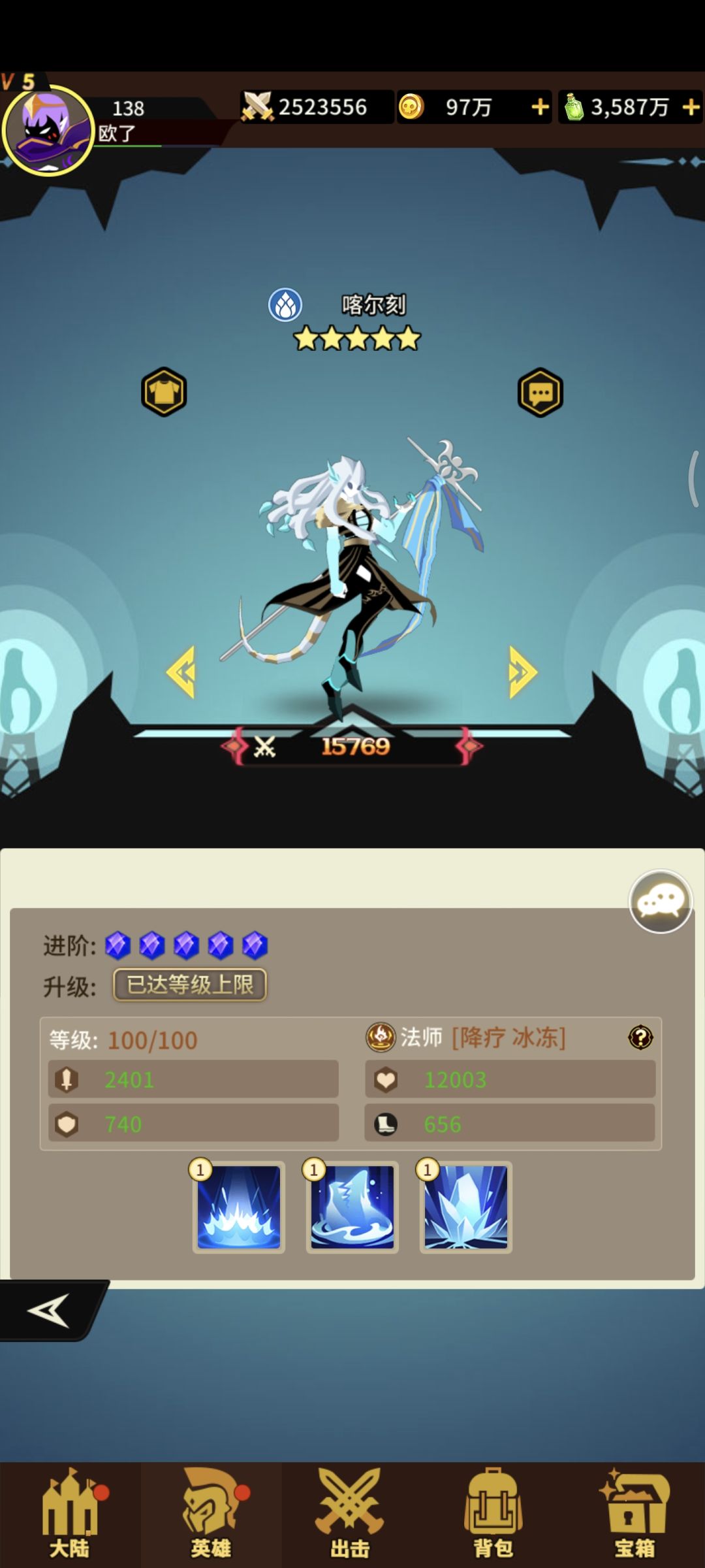 水系法师喀尔刻三技能!获取难度容易!抽卡+宝箱! 一技能打前中排概率降低治疗+降低速度 二技能+生命+速度 三技能随机打三个概率+冰冻满级若目标冰冻必定暴击!!狗粮一枚![表情_举手]#浅评一下