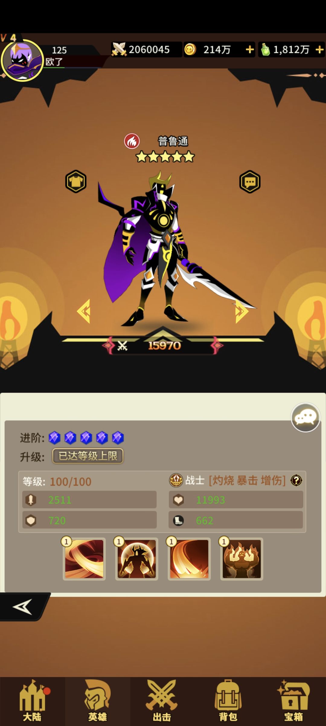 火系战士普路通四技能!获取难度难!抽卡+积分兑换+宝箱!一技能打前中排概率+灼烧如果打的是坦克增加伤害!二技能+生命+攻击+速度满级自身收到攻击概率给施法者+灼烧 三技能打生命最低的敌人单体攻击目标带灼烧或烈焰灼烧必定暴击!四技能对处于灼烧或烈焰灼烧的敌人+伤害!满级优先打带火焰状态的敌人!优秀的战士![表情_+1]#浅评一下