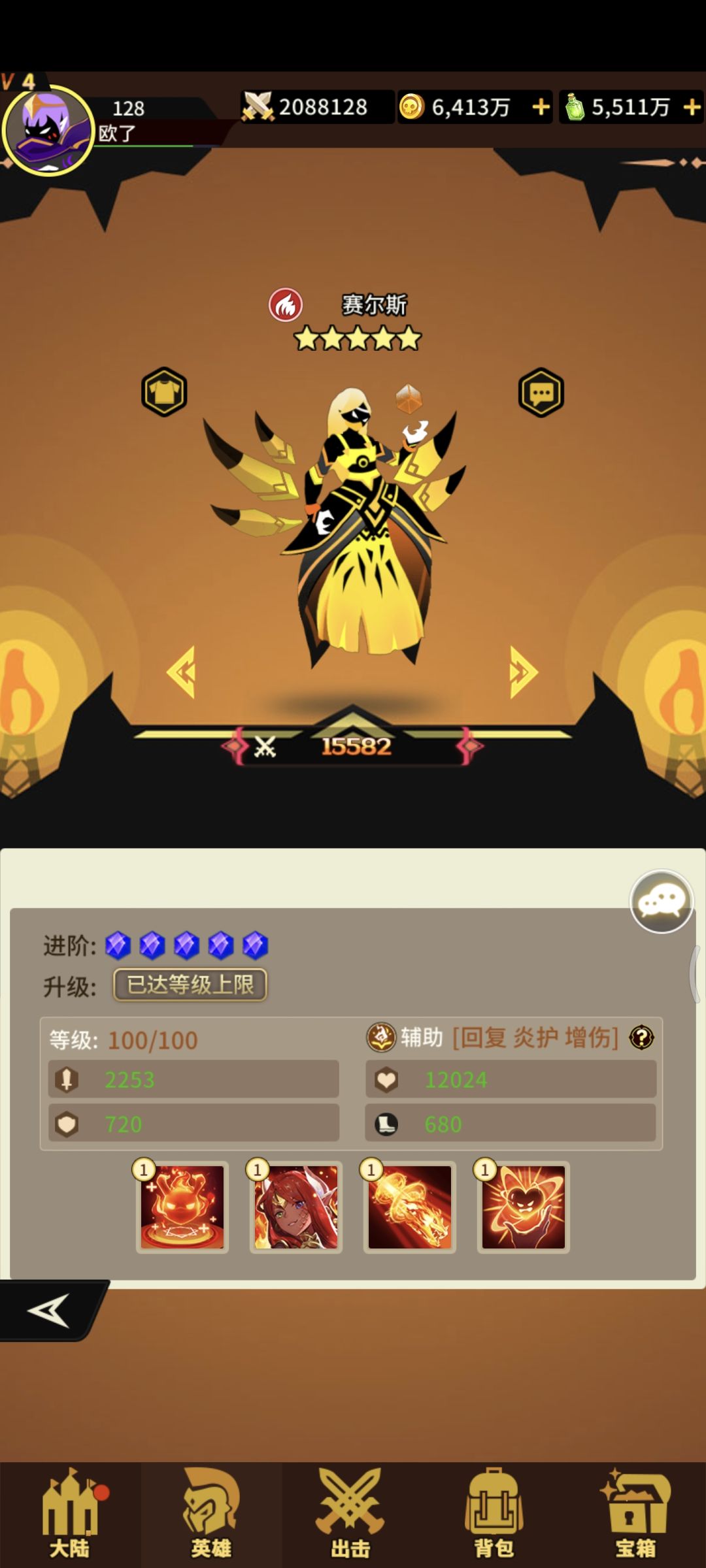 火系辅助赛尔斯四技能!获取难度难!抽卡+宝箱+兑换!一技能给三个队友+生命随机给队友+援护(+防御概率给敌人+烈焰灼烧)满级给两个队友+援护!二技能+生命+攻击+速度!!三技能打四个随机给两个敌人+灼烧 四技能收到持续技能伤害转换部分伤害为生命平摊给存活英雄!治疗量不超过攻击两倍[表情_微笑]挺🐂的辅助!抽不到!