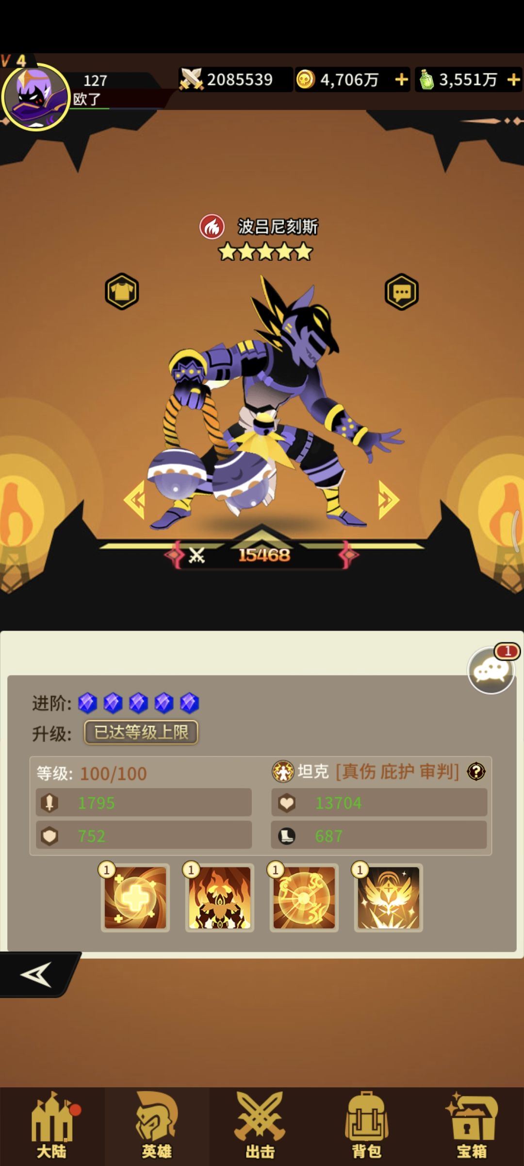 水系坦克四技能!获取难度一般!抽卡+宝箱+积分兑换!一技能单体攻击概率+眩晕如果打的是战士+眩晕几率!二技能+防御+生命+免伤 三技能保护攻击最高单体驱散所有负面状态+免伤+抵抗 两回合 四技能收到攻击给自己+速度最多五层!满级+反击100%无视防御如果是战士必定暴击!![表情_比心]恶心的坦克遇到的难受不难受!战士遇到基本没用了![表情_汗]