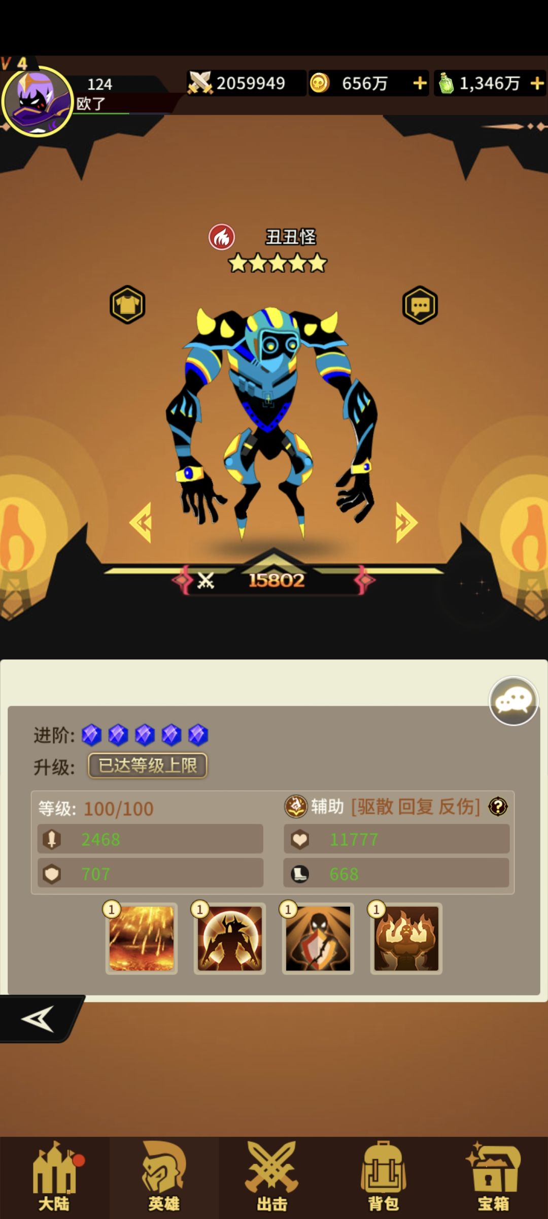 火系辅助丑丑怪四技能!获取难度难!抽卡+宝箱+兑换!两个🈷一个没抽到[表情_微笑]好英雄概率都低!一技能打前中排概率+受伤害提升!满级概率+驱散目标一个增益状态!二技能+生命+攻击+速度 三技能给三个队友+护盾(攻击者受到百分比伤害!类似于反弹盾)四技能队伍暴击就恢复全体百分比血量!这个技能牛逼![表情_比心]抽到就养起来吧[表情_+1]#浅评一下