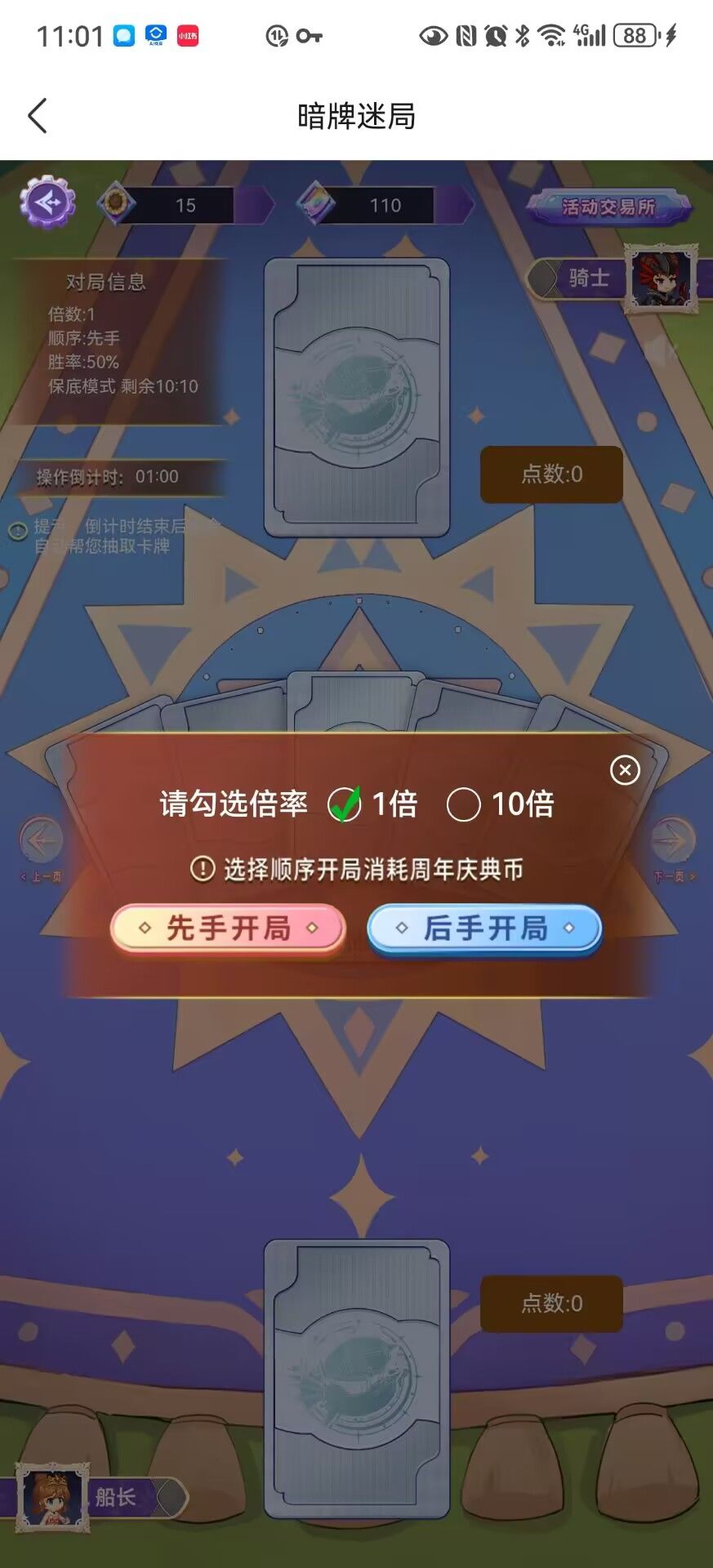 如何进入小游戏:从H5充值界面顶端“一周年庆典”图标进入。 游戏解析: H5小游戏的主要玩法突出一个【随机】——生死有命富贵在天。你和电脑各抽一张牌,然后比拼大小,数字大的一方获胜。 小游戏有两种模式:连胜模式和保底模式。先说结论:保底模式的收益更高。并且船长们还可以选择先/后手。从概率上来说,先后手的获胜概率完全一致,但先手有着0.2的加成,后手只有0.1。需要注意的是,只有在获胜时才会触发先手