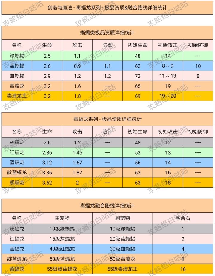表格数据仅供参考,一切以游戏实际数据为主【毒蝠龙】极品资质&融合路线【狼人巫祝】极品资质&融合路线【水晶巨人】极品资质&融合路线【抱抱熊】极品资质&融合路线【龙血拳皇】极品资质&融合路线【皎晶白虎】极品资质&融合路线【祈愿灵翼】极品资质&融合路线【疯疯兔&酷酷狗&炸弹松鼠】极品资质&融合路线