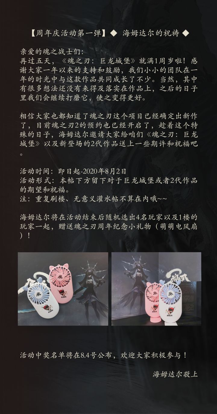 假装分割线~~~~~~~~~~~~~~~~~~~~~~~~~~~在魂之战士的积极参与中【海姆达尔的祝祷活动】算是顺利的结束啦,感谢大家的支持和鼓励额。大家的意见啊,建议啊,鼓励啊我们都收到咯。在今后的研发中我们将会认真的采纳大家的建议,继续完善1代产品的同时,认真准备2代的内容。同时优化我们跟大家的互动模式,让大家更好更及时的了解产品的现状和之后的发展。总之我们会加油的,希望大家能一路陪我们走下