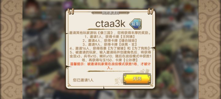 游戏ID:36011邀请码:72f4fc官方群:1041367468我给小萌新的建议是:1、注册游戏一定要填写邀请码,只有一次填写机会,可以领150勾玉(重要)+公孙瓒;2、金币别乱花,先战役打至15关,金币留着打幻想模式,平民崛起的机会,可以通过幻想模式迅速丰富自己的卡组,珍贵卡包必出橙卡!3、幻想模式:①主公选择(新手期): 刘禅>刘备(自带加血)>其余主公②关卡选择: a