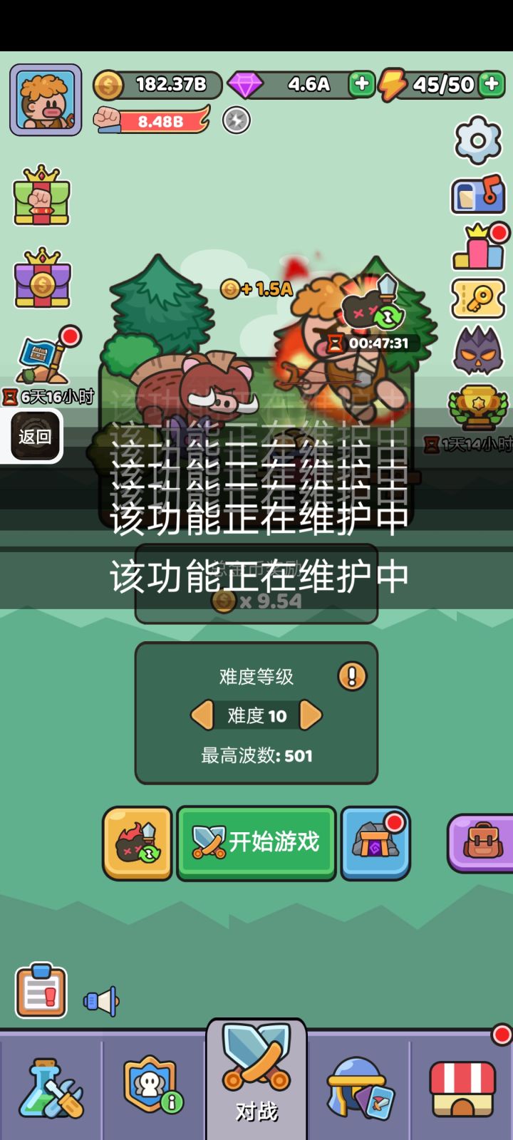 战斗中可以消耗肉临时提升属性,从而打更多波次,获得更多金币,直至通关。战斗过程上重复度比较高,而且没什么看点,容易腻。