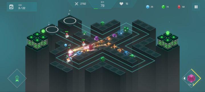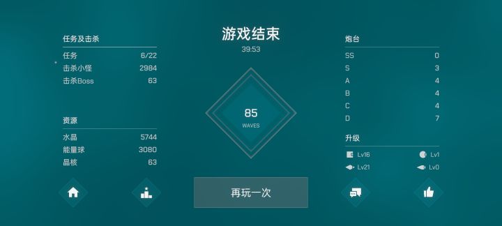 简单123关意外通过,但好像没有保存上去?新功能增加了图鉴,难度选择,目标攻击方式选择。选择后还能看见攻击范围。制作组看来确实在进步。看广告熬水晶把立方体第一个解锁后意外的直接出了,红水晶派上了用场。个人感觉,前期看左上角合成任务,绿色蓝色好出,给的任务奖励能有质变。同步能量等级升级也要跟上,看自己炮台阵容。总得来说还是看脸和运气100关后移动速度就相当快了,激光闪电这种持续伤害类型很难打出高