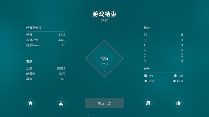 简单123关意外通过,但好像没有保存上去?新功能增加了图鉴,难度选择,目标攻击方式选择。选择后还能看见攻击范围。制作组看来确实在进步。看广告熬水晶把立方体第一个解锁后意外的直接出了,红水晶派上了用场。个人感觉,前期看左上角合成任务,绿色蓝色好出,给的任务奖励能有质变。同步能量等级升级也要跟上,看自己炮台阵容。总得来说还是看脸和运气100关后移动速度就相当快了,激光闪电这种持续伤害类型很难打出高