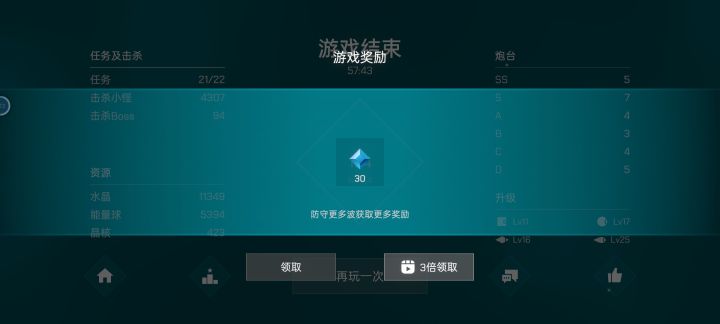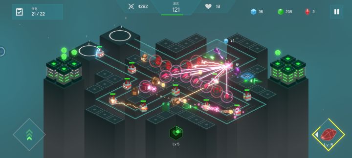 简单123关意外通过,但好像没有保存上去?新功能增加了图鉴,难度选择,目标攻击方式选择。选择后还能看见攻击范围。制作组看来确实在进步。看广告熬水晶把立方体第一个解锁后意外的直接出了,红水晶派上了用场。个人感觉,前期看左上角合成任务,绿色蓝色好出,给的任务奖励能有质变。同步能量等级升级也要跟上,看自己炮台阵容。总得来说还是看脸和运气100关后移动速度就相当快了,激光闪电这种持续伤害类型很难打出高
