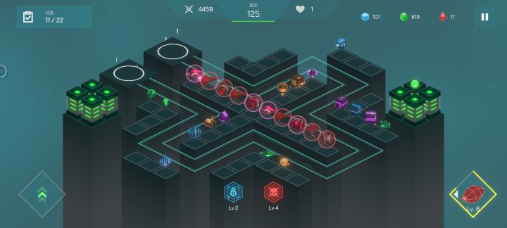 简单123关意外通过,但好像没有保存上去?新功能增加了图鉴,难度选择,目标攻击方式选择。选择后还能看见攻击范围。制作组看来确实在进步。看广告熬水晶把立方体第一个解锁后意外的直接出了,红水晶派上了用场。个人感觉,前期看左上角合成任务,绿色蓝色好出,给的任务奖励能有质变。同步能量等级升级也要跟上,看自己炮台阵容。总得来说还是看脸和运气100关后移动速度就相当快了,激光闪电这种持续伤害类型很难打出高