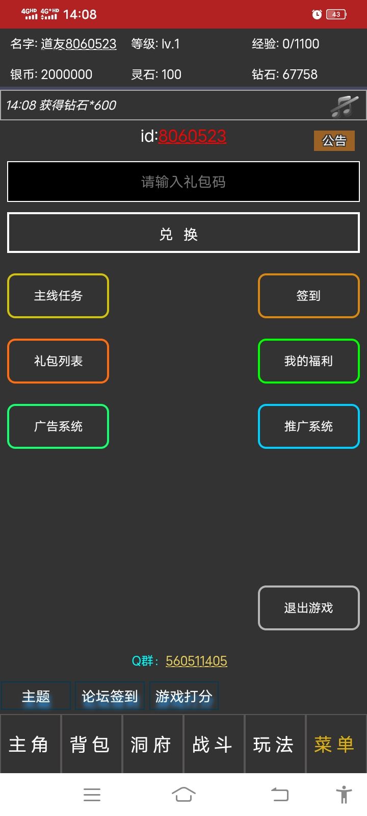 我修炼到了【炼气1层】。主角达到了12级。游戏名字【道友2483863】