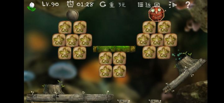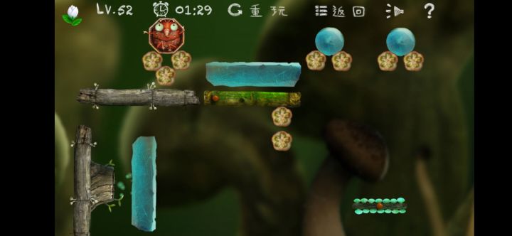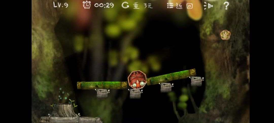 先调整弹簧的角度,等到那个旋转垂直的时候,点小甲虫的枯叶消失,就可以弹第一个树洞。再调整弹簧角度,冰球比较重,还要再往上一点,击碎冰块,点击甲虫另一边下边那个野果,找准旋转的时机,再点击上面那个坚果,就可以把甲虫翘到第二个树洞里了