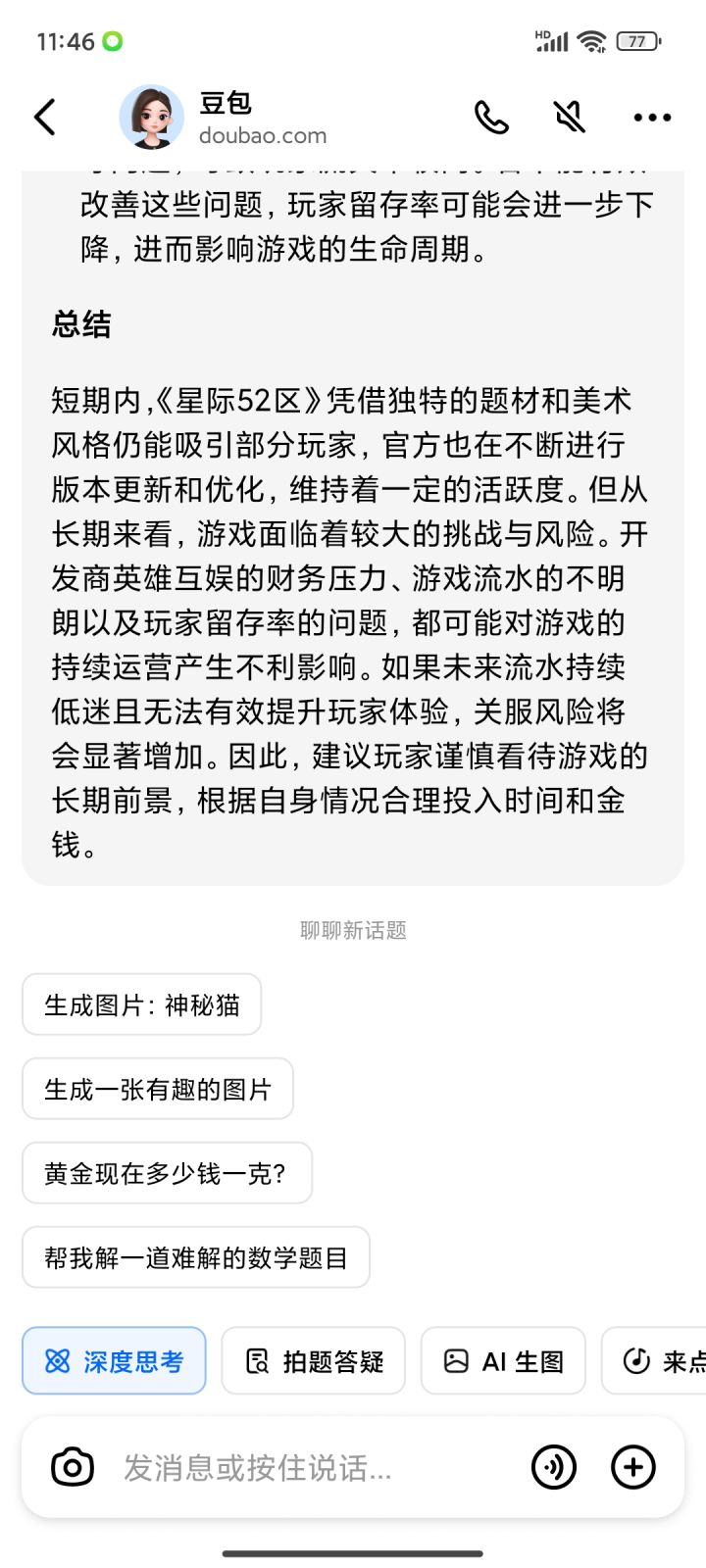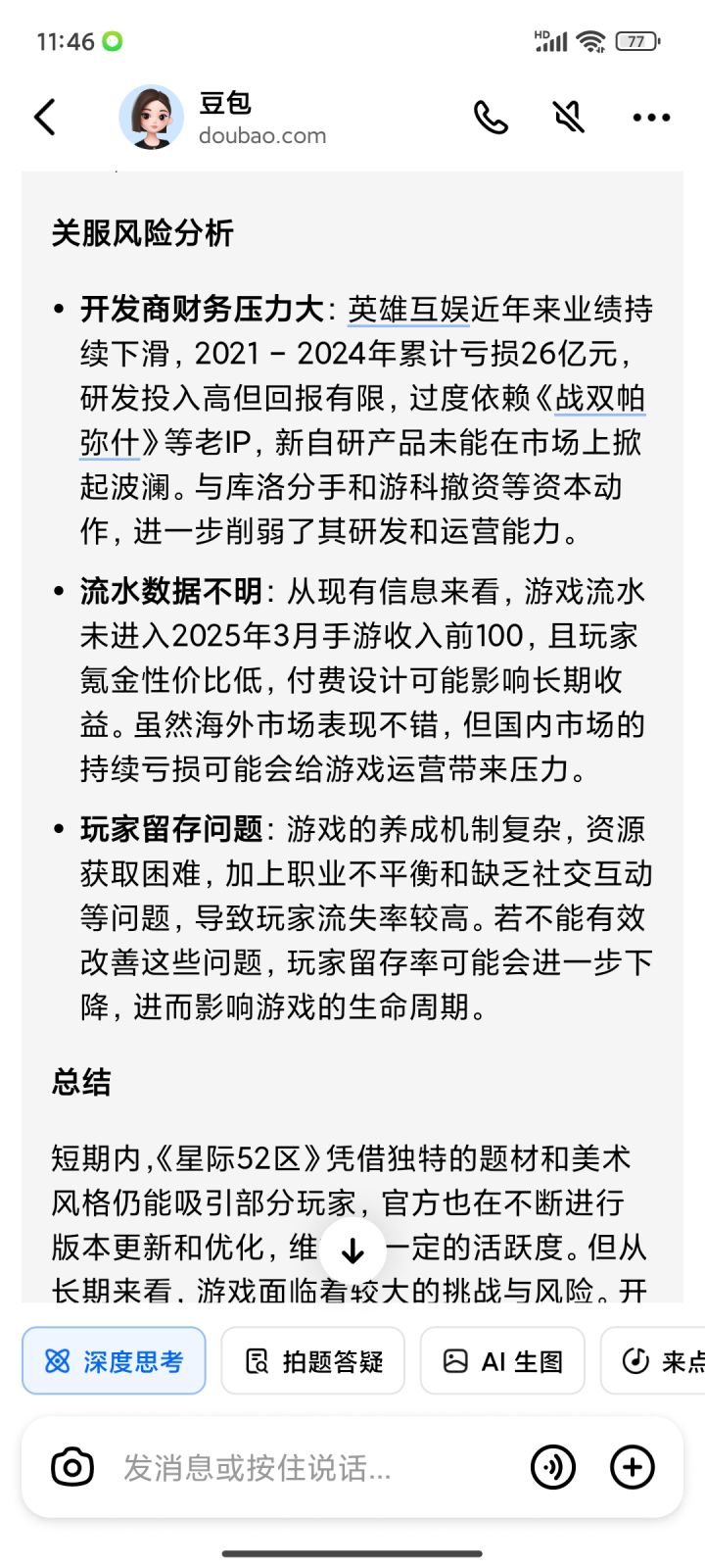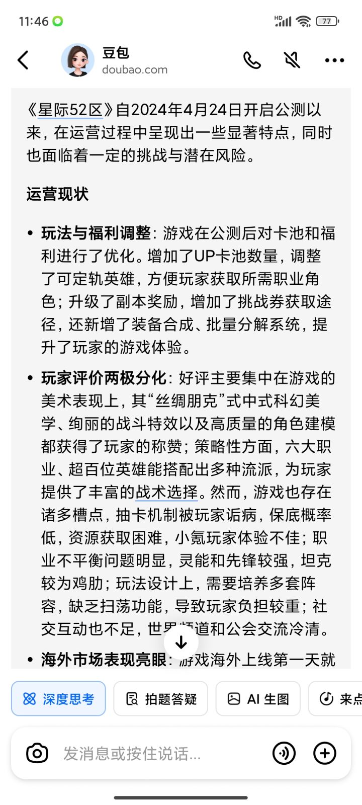不论是画面还是各种细节都不错,人物也很丰富,整个UI也很干净清爽,比国内其他同类型的产品好很多,估计是抽奖之前没法定向所以容易歪导致很多玩家走了,等等各种问题,就问问Ai这个游戏的情况,看来库洛和游科撤资影响很大啊。。。