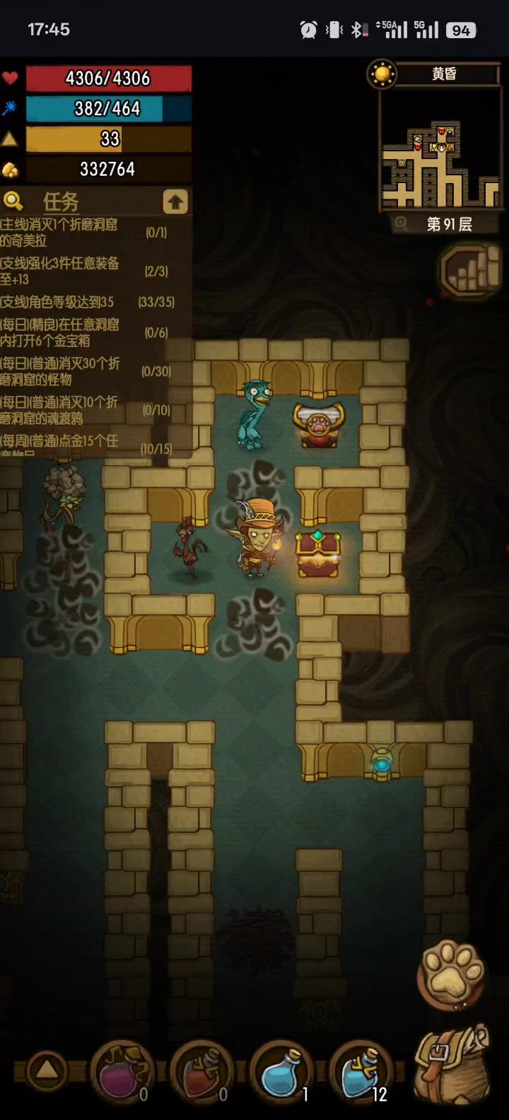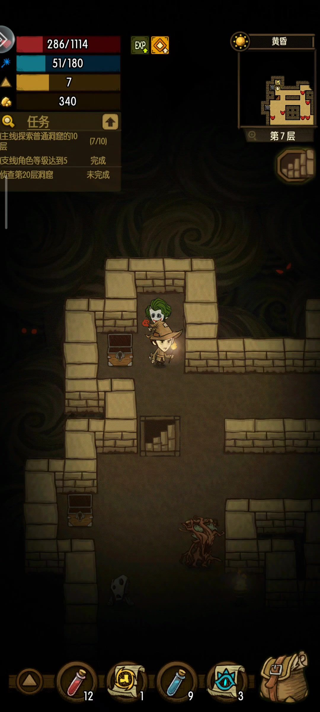 中间出了点小意外,数值太高自杀差点失败 . 原理: 离开洞窟,老头会刷新层数 只要不离开洞窟,有老头层数不变 自杀 = 不离开洞窟,重刷老头 . 卡精英: 和卡老头类似,刷了精英的层数,只要不离开洞窟,这一层就一直有精英(把上面的原理里的“老头”换成“精英”) 重刷的精英,会改变种类(例:普通一层的精英老鼠变成精英盗贼) . “离开洞窟”包括: 1. 点手机退出键“√” 或 背包“返回主界面” 2