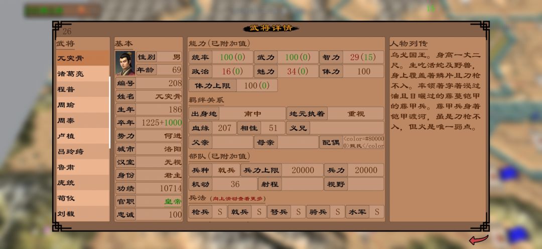 开局选了何进,招核心武将兀突骨、周泰,然后一些特性将鲁肃、招兵加成的。。。。然后把何进送死,把兀突骨当君主,直接打洛阳当皇帝。兵少没关系,走位好点直接单挑君主,让兀突骨当皇帝就起飞了,2万兵的兀突骨,可以说一个满城满兵的城都能轻松打下来。 后面就简单了,周泰练起来,也能一人打有港口的城。 然后就是招女的结婚兀突骨增加兀突骨的统和武,兀突骨确实强,战斗中没有人能打他超过500兵,基本都是打100来兵
