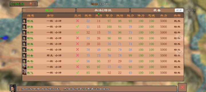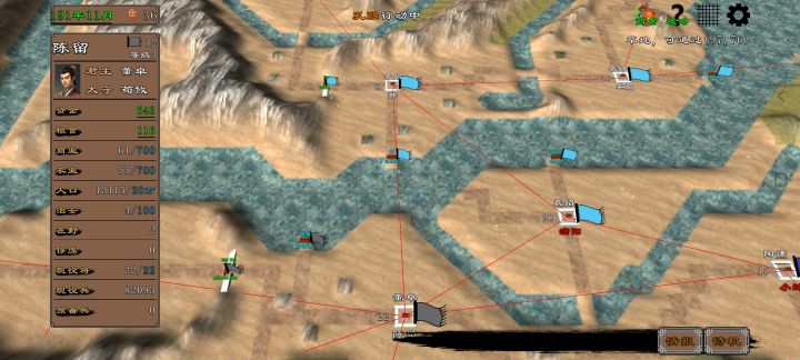 1:内政,城市治安高是很重要的,前期注意发展“中心城市”,为后面打基础的核心,其他城市治安什么都不用管。然后这游戏最核心的爆兵思路,实际上是利用称号“名声”。带这个称号的武将都是神,征兵+解散可以获得70%多的人口爆发,一两年即可城市所有属性拉满。征枪兵哈。2:打架:主要思路还是卡桥,周围没桥就跑远点找有桥的地方,堵路口,需要两个枪兵(便宜),和一个高统弓兵卡三个出路点,然后把敌人挨个歼灭。前期