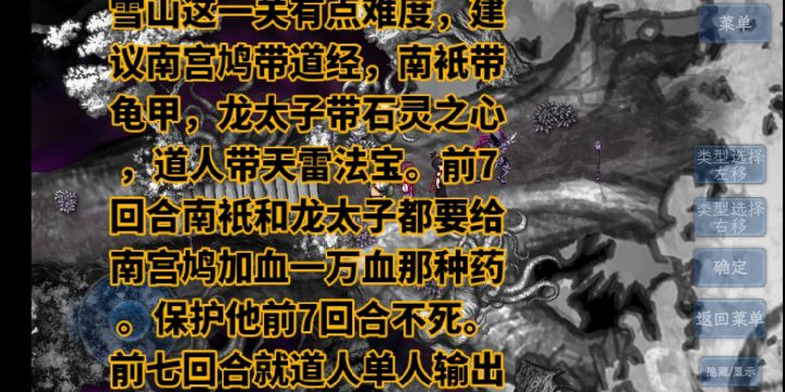 焱龙山脉,镇龙塔:南宫鸠带天雷,孟婆带道经,南衹带妄魔剑。雪山后山那个boss,记得保用药保南宫鸠7回合,第6回合放减法伤技,第七回合放五连鞭。道人放大招。