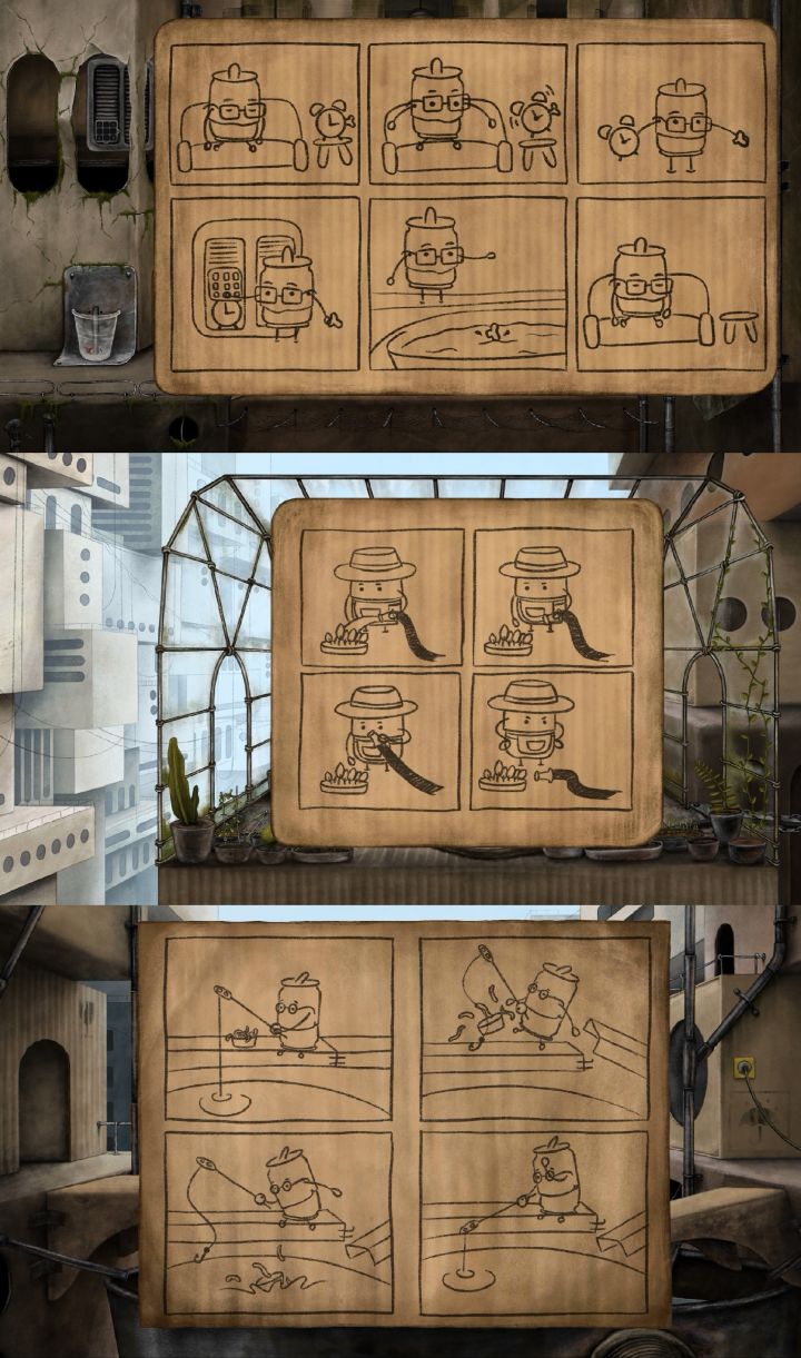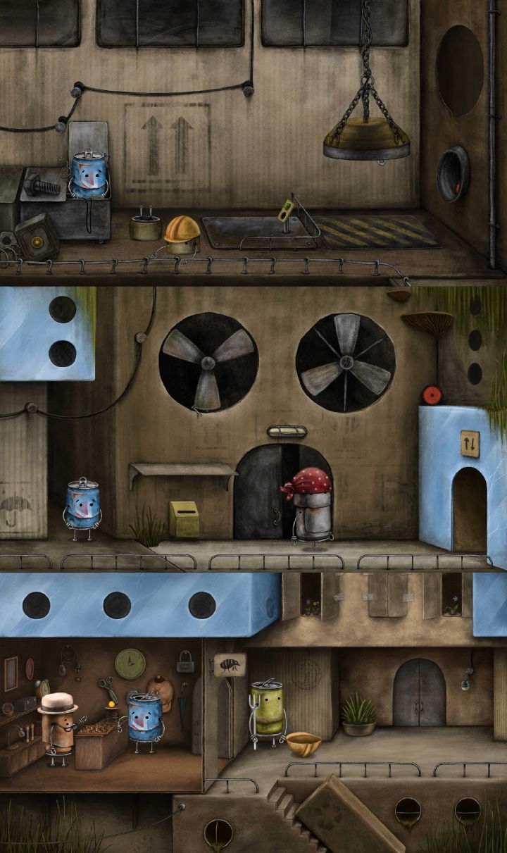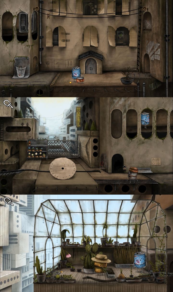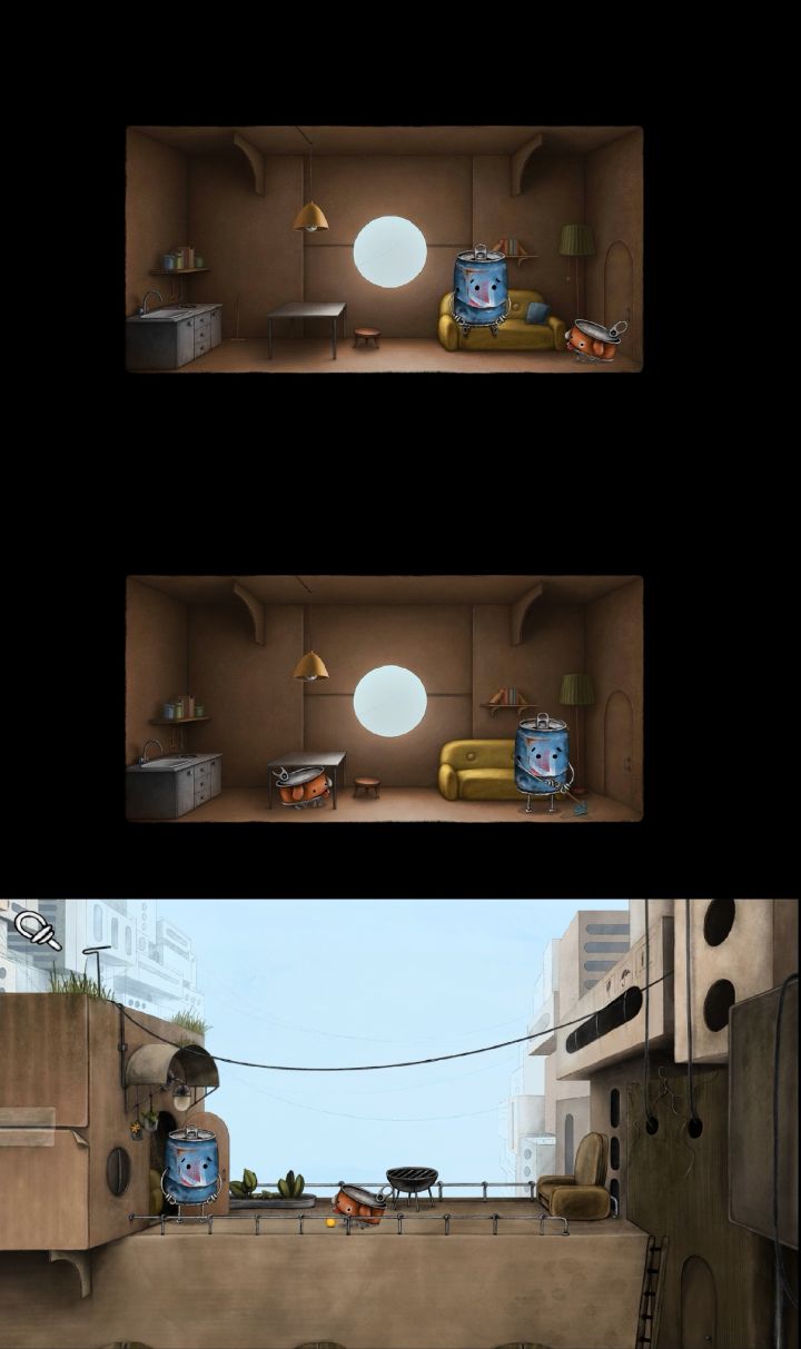 很有趣、可爱的解谜游戏。游戏以一个名为Blue Can的罐子为主角,它生活在一个满是旧罐头盒子的城市。在一次地震后,它的罐子狗狗失踪了,自此它便循着踪迹踏上了寻找之路。这一路上,它遇到很多罐子同类,一步步解开谜题,帮助它们,同时也在它们的指引下,找到罐子狗狗,用3枚金币从意图将其当作炮弹发射的恶霸罐子手中赎出,最终回到它们的小家。游戏画风独特,和早期的经典解谜游戏《机械迷城》画风相似,也与国内胖