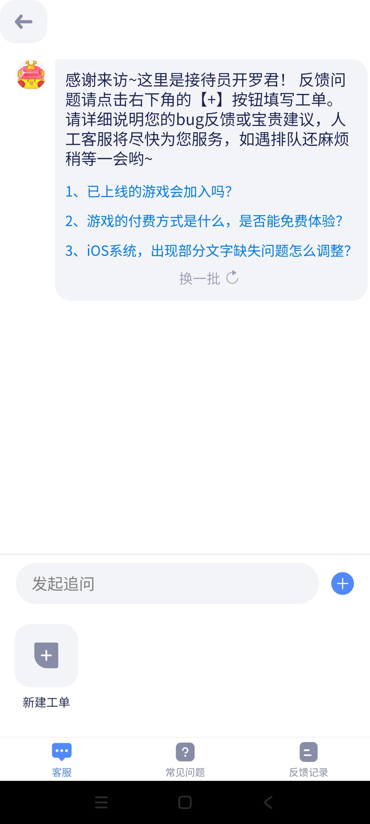 发现游戏bug想要反馈,联系客服点选新建工单只能显示以前的工单。