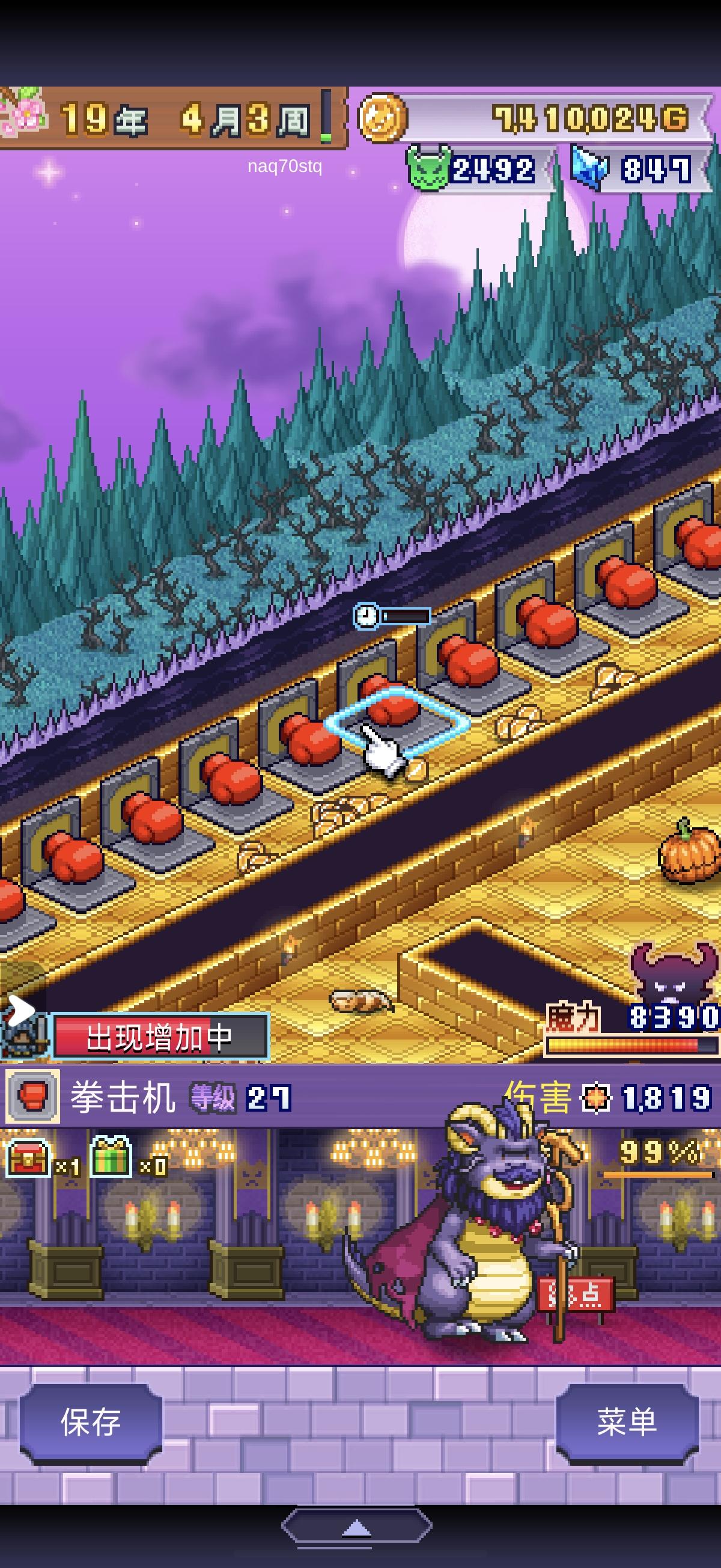 只讲第一档怎么过,通关一次后有继承会容易很多。1,房间人口和最小格子数:7格3人,11格4人,17格5人,25格6人,35格7人。三个一样的怪物在同一个房间涨全属性10%,房间超员扣全属性50%。2,怪物房间可以不通道路,方便冒对话框讨要礼物。经常送礼能提高勤奋度,勤奋度1:1加成魔力,是主要魔力来源,也是16年结算参考值之一。3,更新后,其他房间的宝箱会被打开,魔王房间的宝箱在魔王嗝屁前都