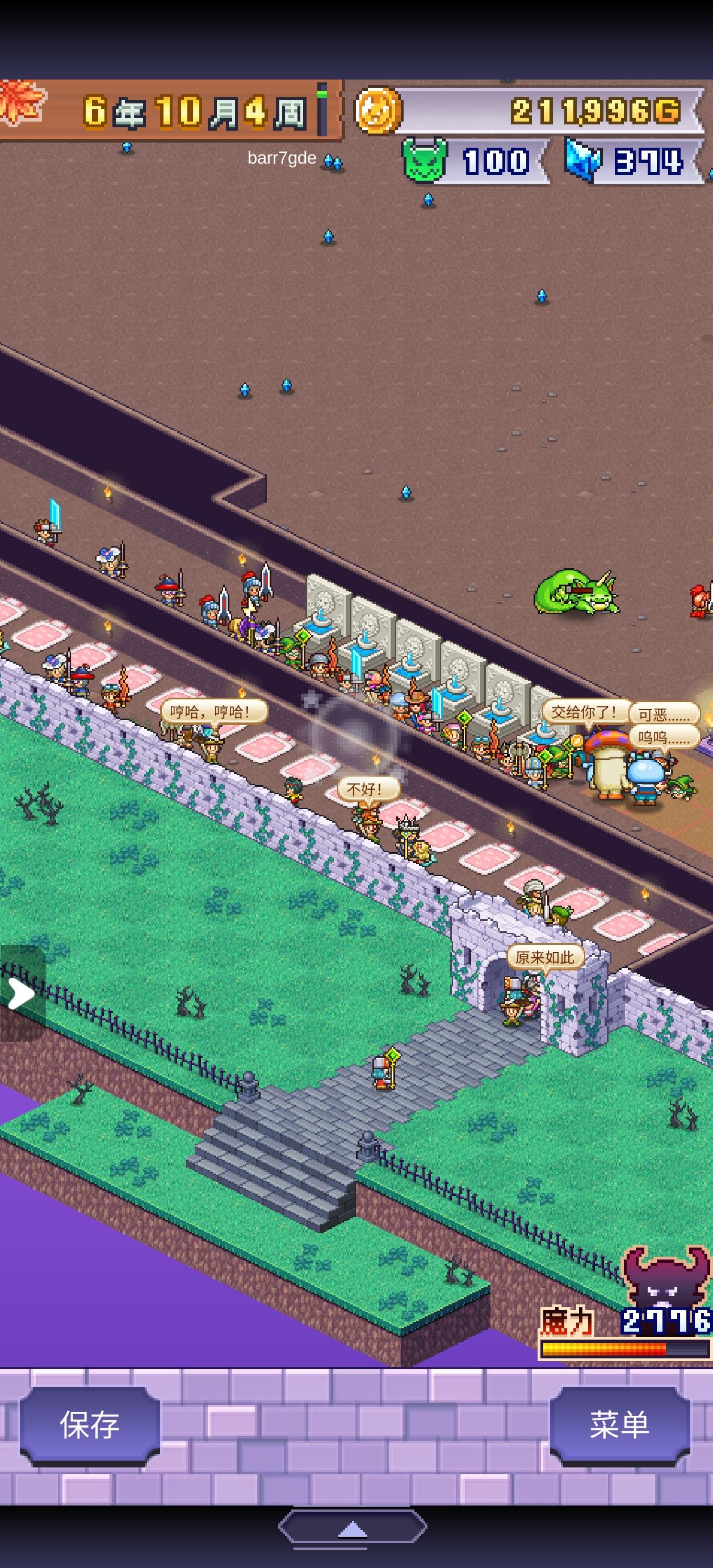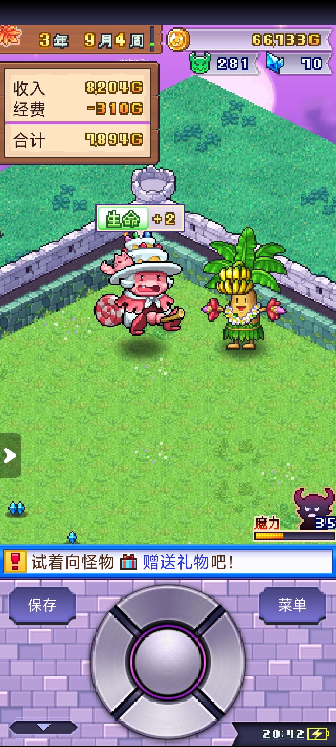 只讲第一档怎么过,通关一次后有继承会容易很多。1,房间人口和最小格子数:7格3人,11格4人,17格5人,25格6人,35格7人。三个一样的怪物在同一个房间涨全属性10%,房间超员扣全属性50%。2,怪物房间可以不通道路,方便冒对话框讨要礼物。经常送礼能提高勤奋度,勤奋度1:1加成魔力,是主要魔力来源,也是16年结算参考值之一。3,更新后,其他房间的宝箱会被打开,魔王房间的宝箱在魔王嗝屁前都