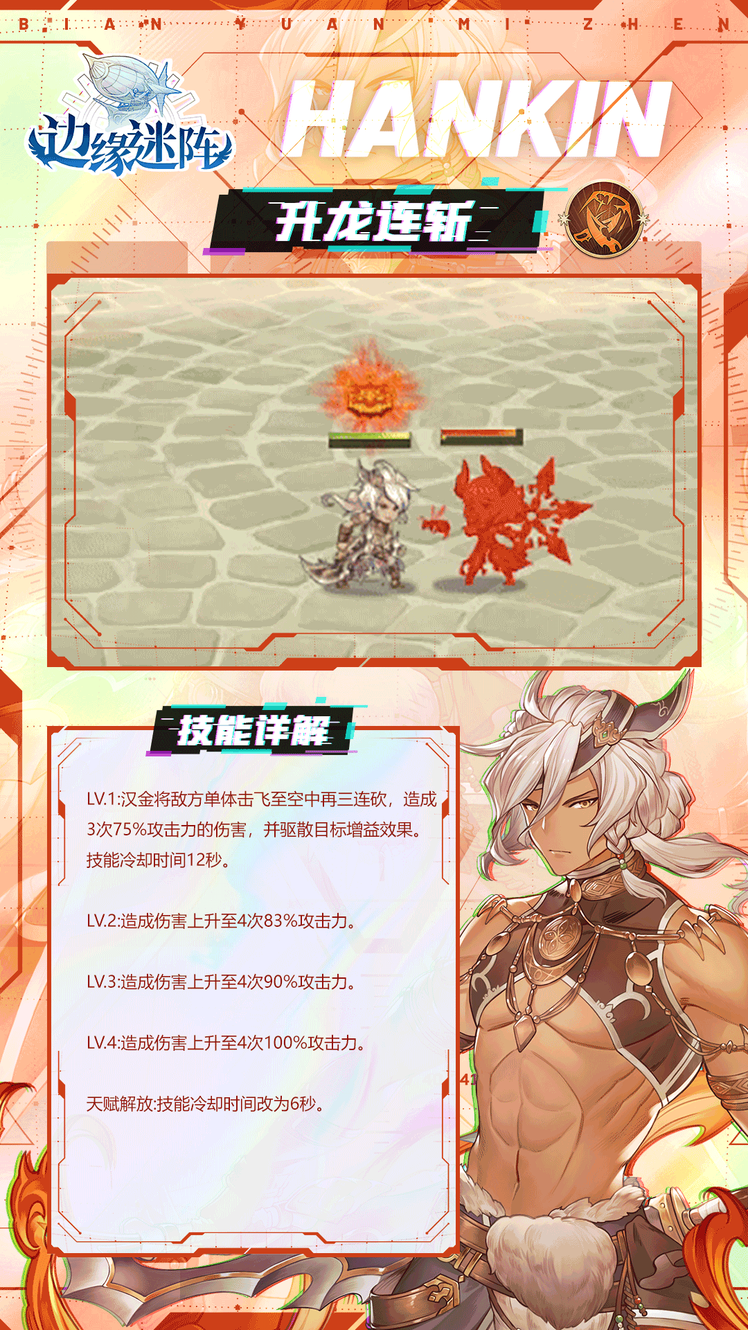 冒险家们好,SR级英雄「汉金」是冒险者联盟的高阶成员,他的特技是与迅猛龙一同出战。他手中的双刃能够制服对手,并且驱散目标增益效果。让我们一起来认识一下他吧~✦汉金的故事✦那一年,父亲必须随着商队前往苏娜城做生意,带上了年仅七岁的汉金,途中却遭到黑帮打劫。其父亲对于盗贼恶混早已见怪不怪,然而那一次拦截商队的规模却是前所未见。父亲为了保护他,命丧于毒吹箭下……不,或许该说整个商队都被歼灭了。他