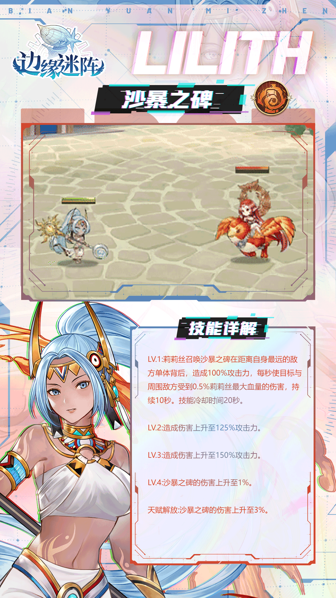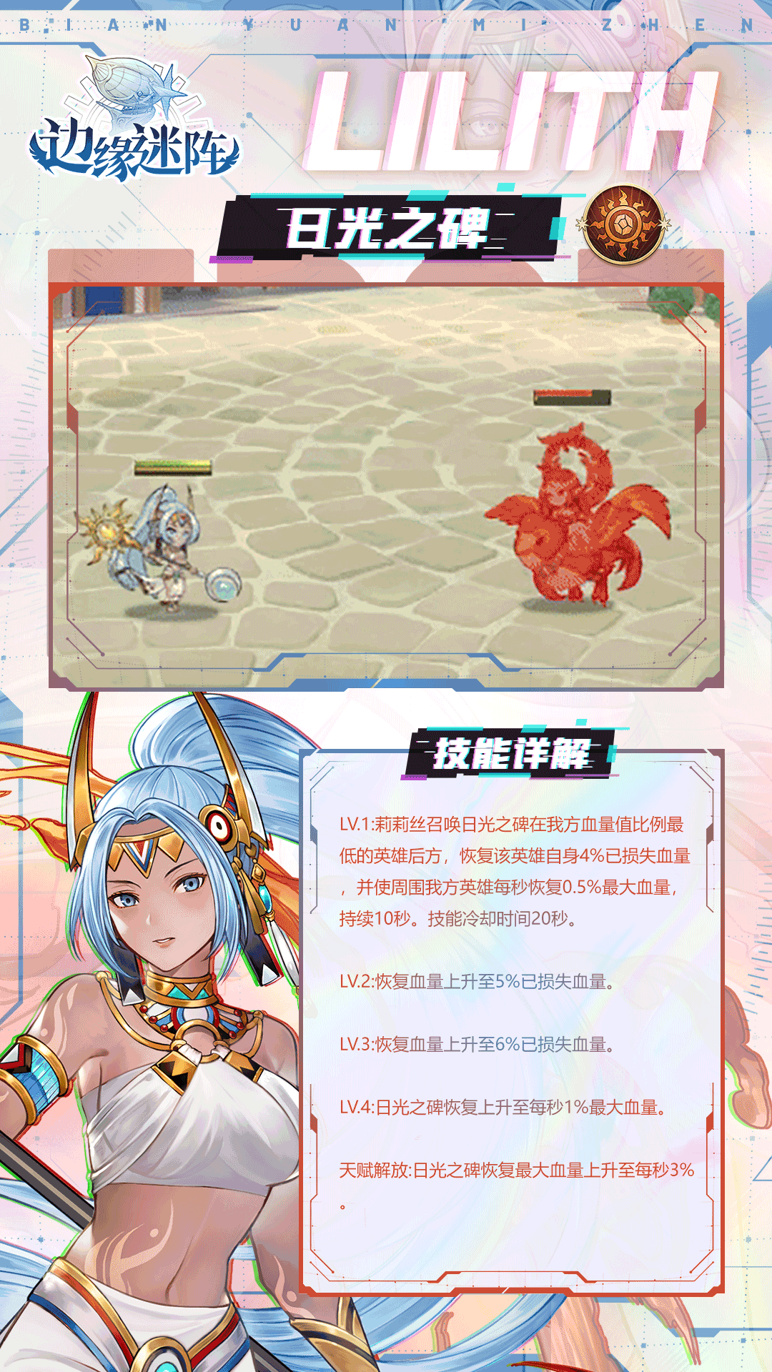 冒险家们好,SR级英雄「莉莉丝」是查堤亚部落的神女之一。能够召唤日光之碑帮助队友或者召唤沙暴之碑来与敌军战斗。让我们一起来认识一下她吧~✦莉莉丝的故事✦记不得是从什么时候开始的。只要占卜完后,她便会拉着娜蒂法去喝酒。几杯黄汤下肚后,那畅快的滋味总能帮她扫除心情不好的阴霾,还会不自觉的说很多很多话,像是要把想讲的、没讲的话通通都吐出去一般--虽然当下说了什么话她都不记得了,她只记得每次酒醒之