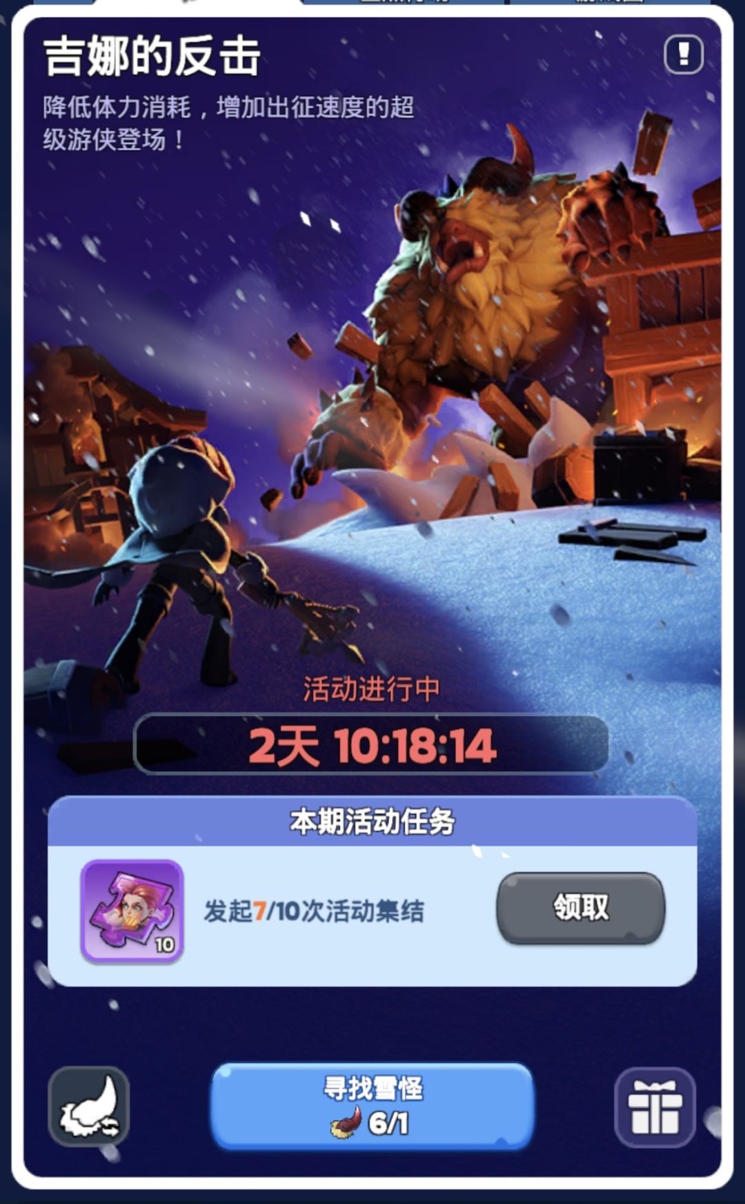 1、活动期间,击败野兽可能获得雪怪的角,三天内多余体力可以全部刷野怪。活动前可根据常规活动中的日历,提前一天适当保存领主体力,活动持续三天,免费领主体力完成足够。 2、使用雪怪的角发起集结,击败失控的雪怪,每轮活动发起10次集结,获得吉娜信物10个。 活动期间集结10次以后,及活动结束期间,使用雪怪的角仍然能获得奖励,无需担心雪怪的角过期。 吉娜满星后,血怪的角可兑换袋子换取奖励,多余碎片可以等