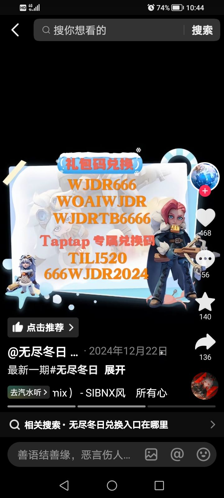#无尽冬日 #无尽冬日兑换码 常规活动﹣>懔冬之邀﹣->输入邀请码! 邀请码:hOwqVb 领取1小时加速卡x100、黄金钥匙50把钻石10000 (时间快到了,抓紧时间) 无尽礼包码 新增兑换码 礼包码:CHANGJIA520 礼包码:WJDR1001 礼包码:666WJDR2024 礼包码:CPDD2024 礼包码:80W2024 礼包码:TAP10W 礼包码:WJ66
