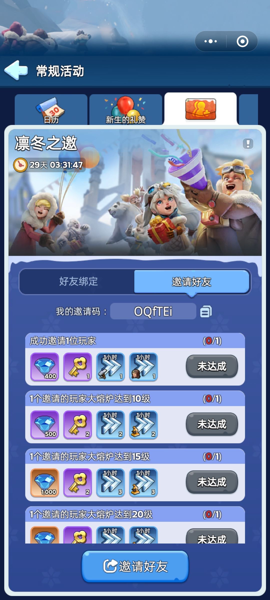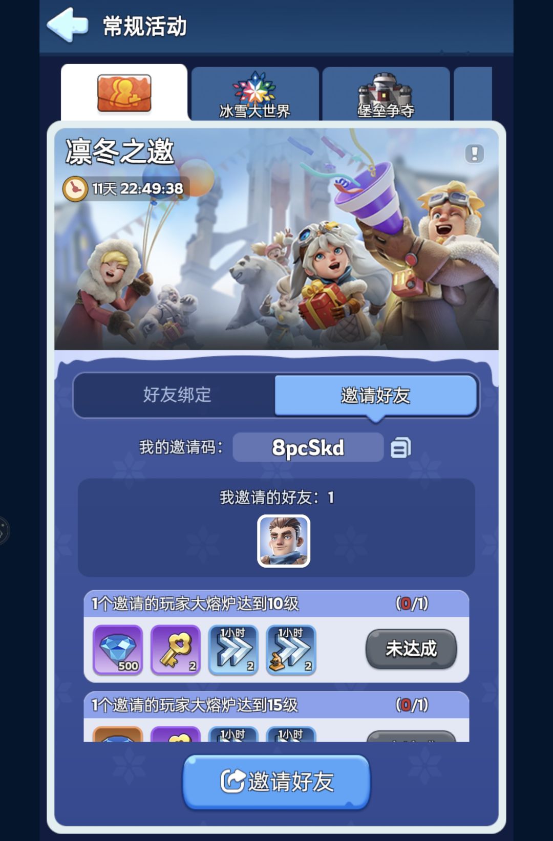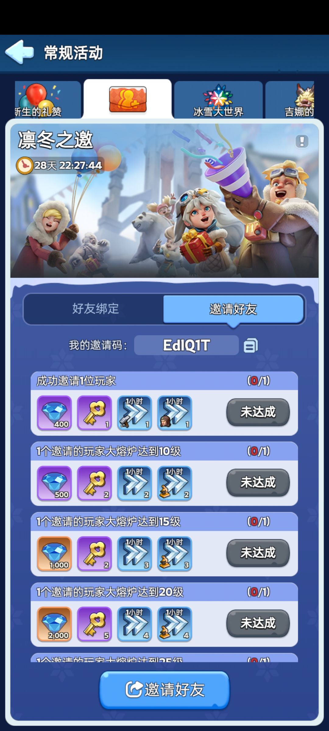 常规活动最后一天>凛冬之邀【好友邀请码】输入: EdlQ1T 填完立领50000钻石,各种建设加速,凛冬之邀活动里可以绑定拿奖励!秒升30级!!!嘎嘎上堡必定稳拿30级炉子奖励,一起领金钥匙和钻石奖励吧 兑换码: WJDR666、WOAIWJDR、WJDRTB6666、WJDRtaptap、666WJDR2024、WJ11111、WJ88888、WJDR222、WJDR899、WJDR168、