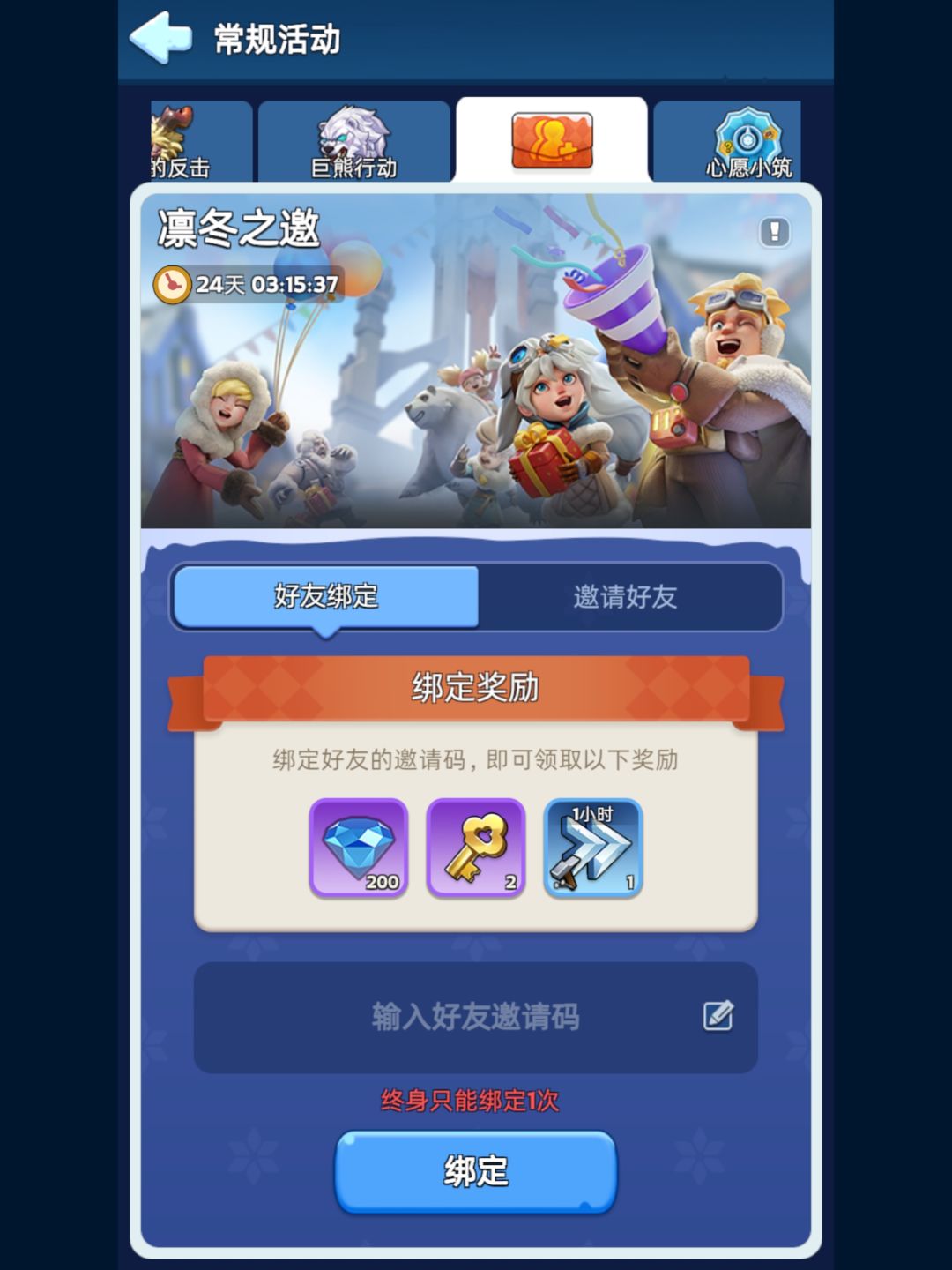 常规活动最后一天>凛冬之邀【好友邀请码】输入: EdlQ1T 填完立领50000钻石,各种建设加速,凛冬之邀活动里可以绑定拿奖励!秒升30级!!!嘎嘎上堡必定稳拿30级炉子奖励,一起领金钥匙和钻石奖励吧 兑换码: WJDR666、WOAIWJDR、WJDRTB6666、WJDRtaptap、666WJDR2024、WJ11111、WJ88888、WJDR222、WJDR899、WJDR168、