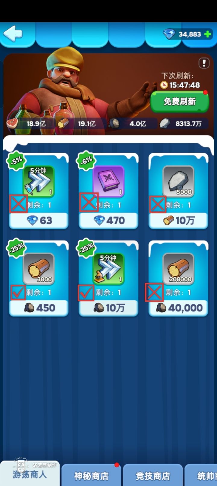 游戏名称:#无尽冬日 游戏类型:模拟生存/经营策略/种田本期攻略:常规商店 常规商店是指商店里随时可以换商品,规定时间刷新商品,商店不会消失。不是限定活动的商店会消失,要在规定时间内换完。一、游荡商人1.资源换高迁换加速,不管有没有优惠%,即使没有优惠%,所有可以用资源购买的划算!遇到高迁?那大赚特赚!0氪白嫖高迁的核心途径。2.资源换资源,资源的比例为等比例交易,所以不存在亏本的问题