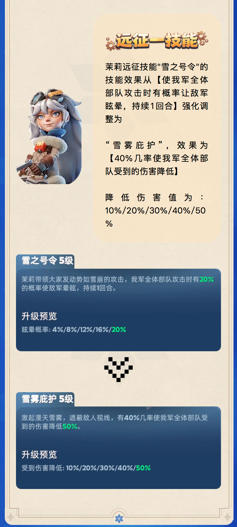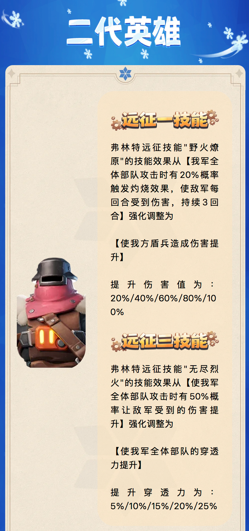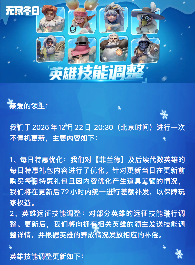 亲爱的领主:我们于2025年12月22日 20:30(北京时间)进行一次不停机更新,主要内容如下:1、每日特惠优化:我们对【菲兰德】及后续代数英雄的每日特惠礼包内容进行了优化。针对更新当日在更新前购买每日特惠礼包且因内容优化产生道具差额的情况,我们将在更新后72小时内统一进行差额补发,以保障玩家权益。2、英雄远征技能调整:对部分英雄的远征技能进行调整。更新后,我们将向拥有相关英雄的领主发送技