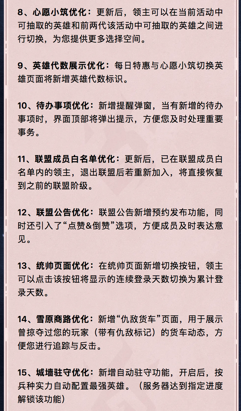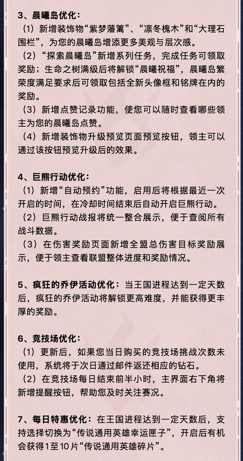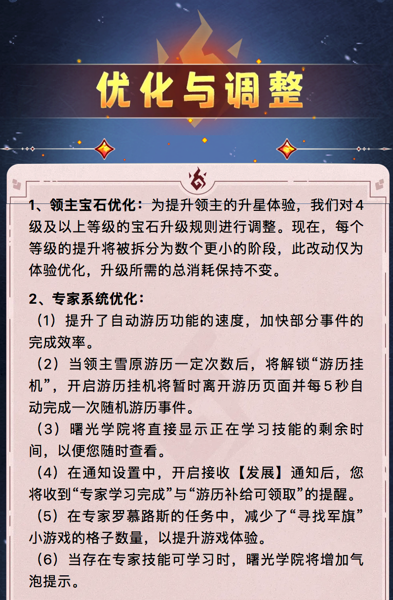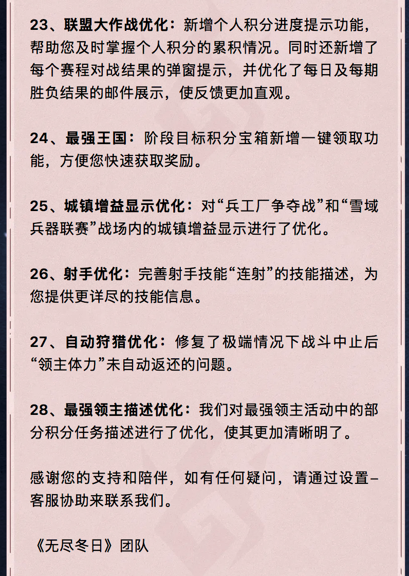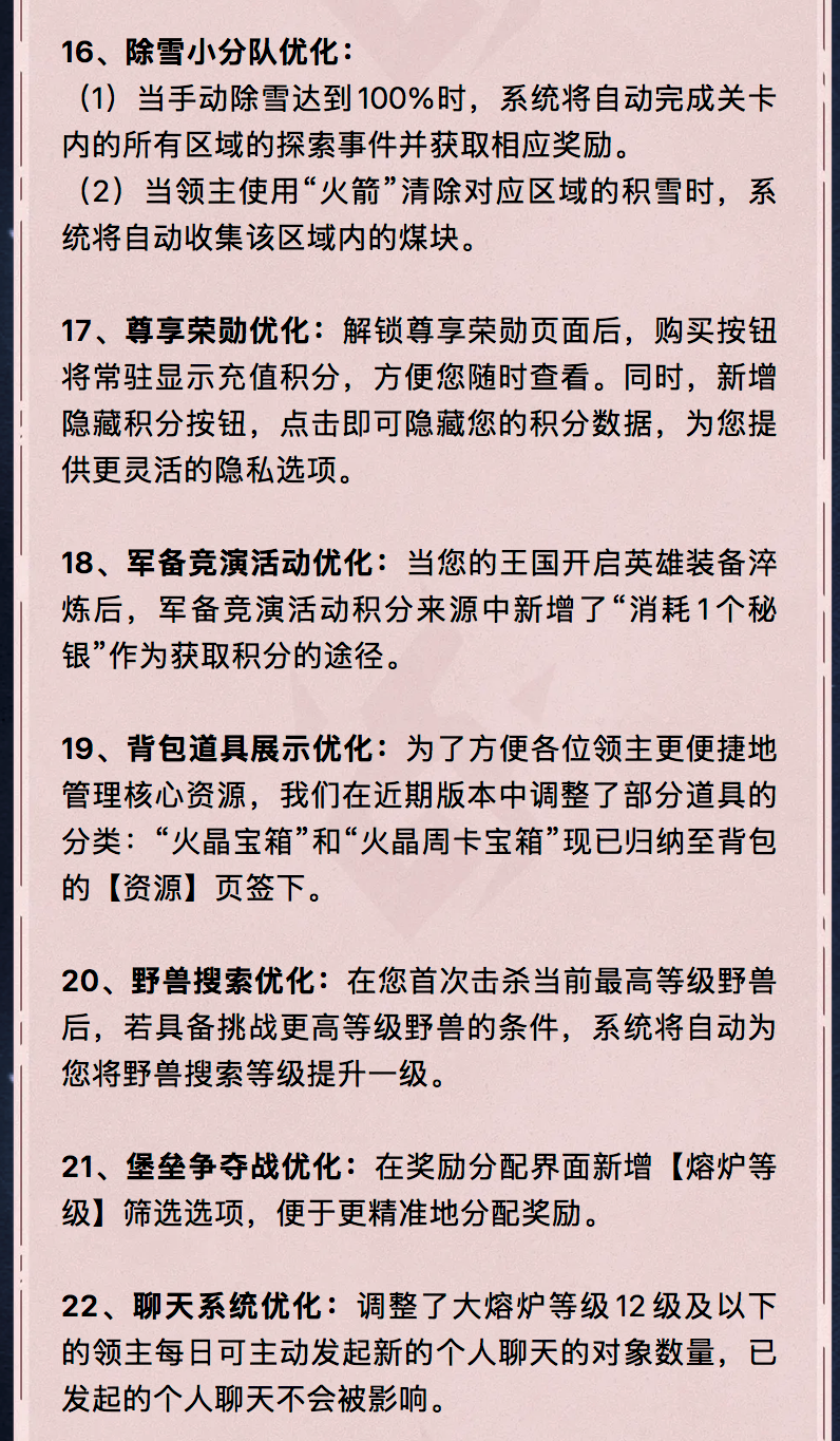 亲爱的领主:我们将在1月21日14:00-17:00(北京时间)进行服务器重启,届时您可能会出现2-3分钟的断线,您可以尝试重新连接。 以下是本次更新的详细内容:最后茉莉给看完的领主们送个小兑换码兑换码:0120WJDR有效期至:2026-1-22 23:59:00兑换要求:大熔炉等级大于等于9级
