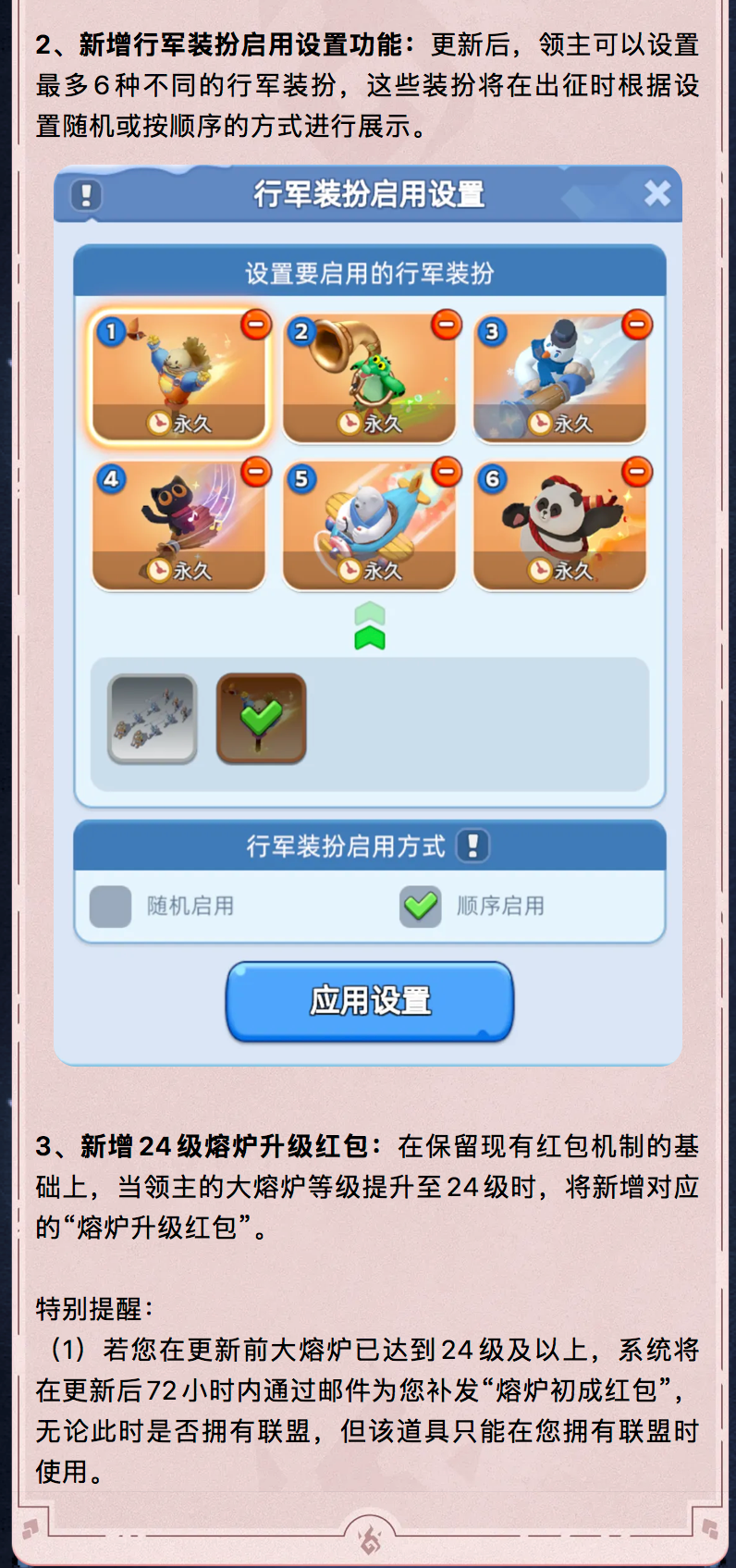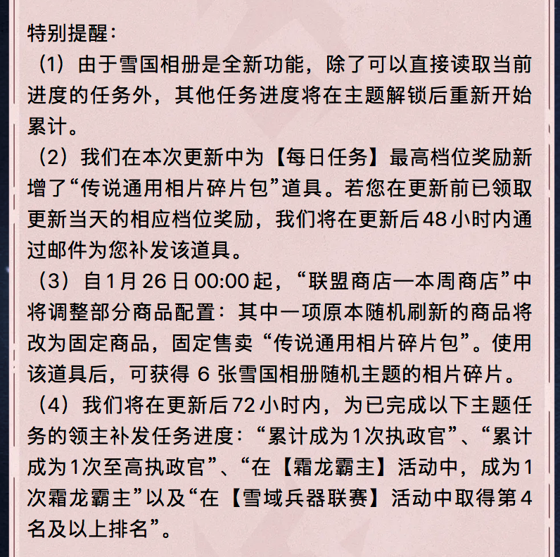 亲爱的领主:凛冽的风雪掩埋了古老的秘密,但传说中失落的宝藏仍在雪原深处等待。让我们踏破深雪,揭开冰封的谜题,让珍宝与传说重见天日!活动时间:2026年1月20日 00:00:00至2026年1月25日 23:59:59(北京时间)活动包含:“雪原大冒险”,“冒险家特训”,“冒险的乐章”和“冒险商队”温馨提示:“冒险的商队”开放时间为2026年1月20日 00:00:00至2026