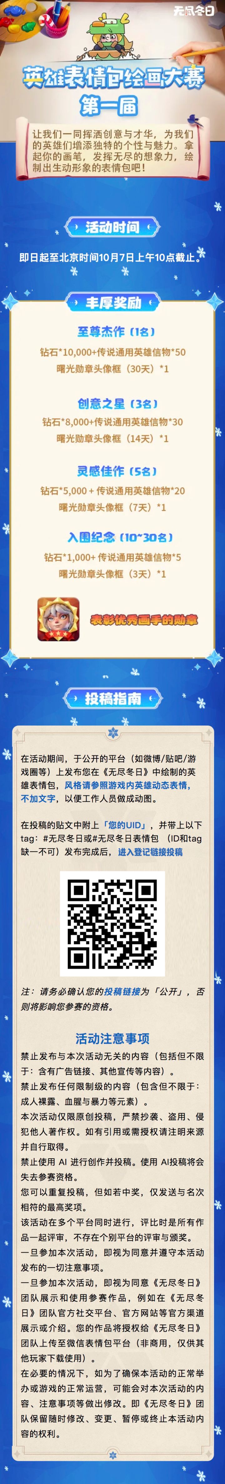征稿活动 | 拿起画笔,绘制英雄表情包吧~我们会让表情包动起来哦! 活动时间:即日起至北京时间10月7日上午10点截止。 投稿指南: 在活动期间,于公开的平台(如微博/贴吧/游戏圈等)上发布您在《无尽冬日》中绘制的英雄表情包,风格请参照游戏内英雄动态表情,不加文字,以便工作人员做成动图。 在投稿的贴文中附上「您的UID」,并带上以下tag:#无尽冬日或 #无尽冬日表情包 (ID和tag缺一不可)发