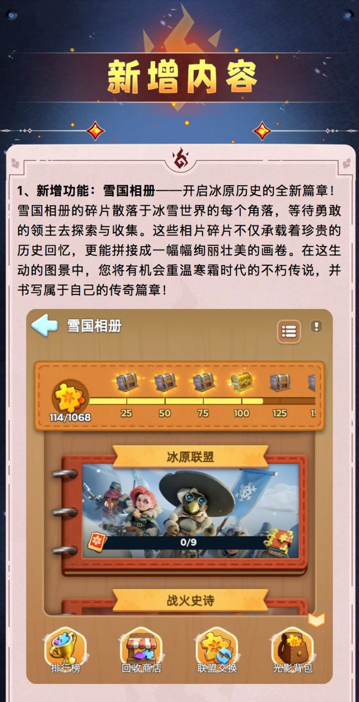 亲爱的领主:凛冽的风雪掩埋了古老的秘密,但传说中失落的宝藏仍在雪原深处等待。让我们踏破深雪,揭开冰封的谜题,让珍宝与传说重见天日!活动时间:2026年1月20日 00:00:00至2026年1月25日 23:59:59(北京时间)活动包含:“雪原大冒险”,“冒险家特训”,“冒险的乐章”和“冒险商队”温馨提示:“冒险的商队”开放时间为2026年1月20日 00:00:00至2026