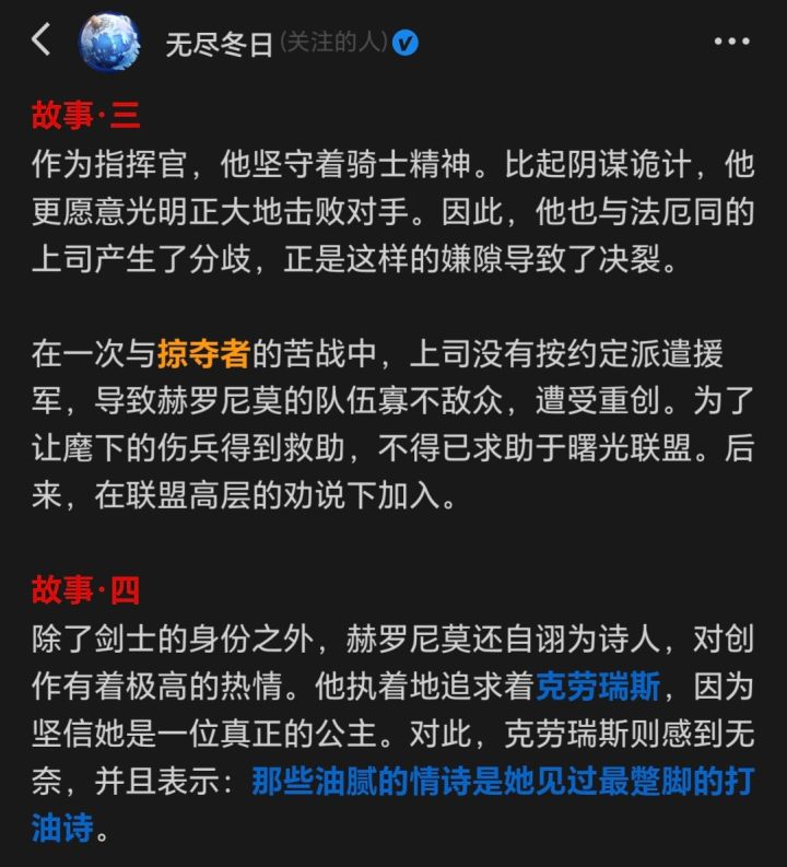给大家扒一扒赫罗尼莫追妻感情史赫罗尼莫身为旧贵族,在投奔了曙光联盟后爱上了盟里口口相传的“太阳城落难公主”克劳瑞斯(就是这个金发挖肉矿英雄)然后对克劳瑞斯展开了“写情书——被当成坏人——送玫瑰——被拒——送礼物——被拒——高调搞了个超浪漫的场景,送礼送玫瑰还和人家一起坐热气球——小姑娘终于对她笑了”的情节。总之:只要够有钱,就能把到妹(其实长得也不赖,就是太油了所以一开始被拒绝了)#无尽冬日 #