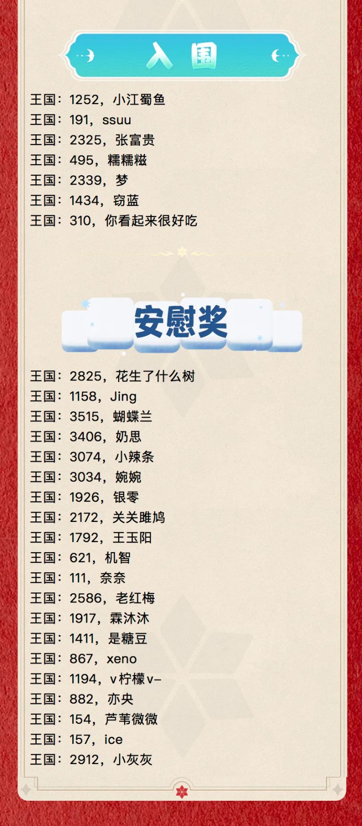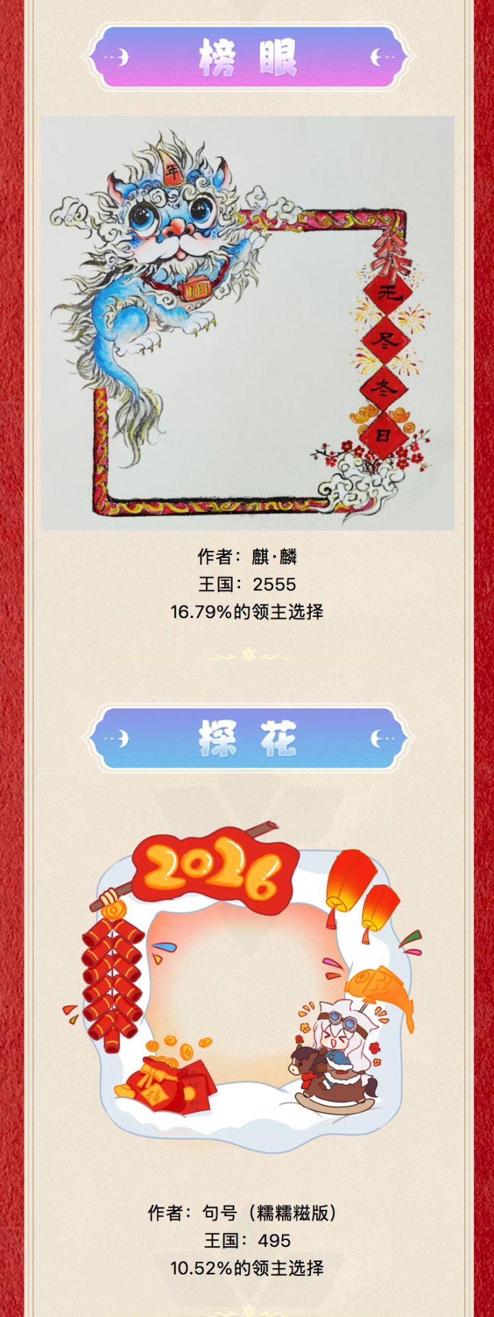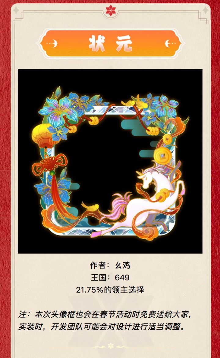 《无尽冬日》春节头像框设计大赛已落下帷幕本次投票活动于游戏内盛大举行每位玩家仅限一票确保比赛过程公正无私,绝对公平领主们快来看看这次的结果吧(≧∀≦)ゞ